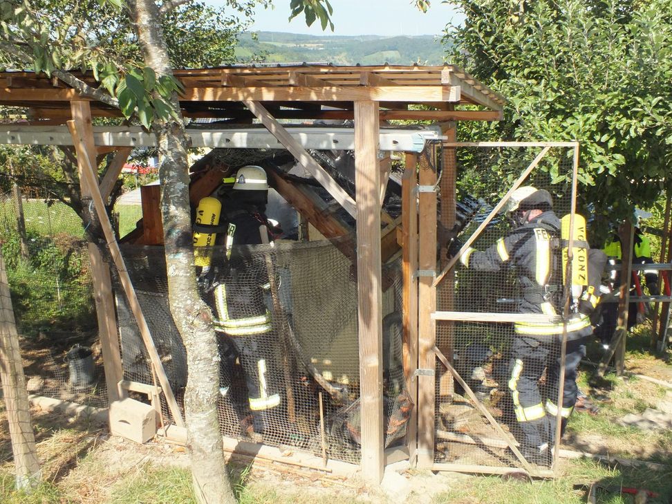Der Hühnerstall stand im Garten eines Einfamilienhauses.Warum das Dach in Flammen aufging, ist derzeit noch nicht klar. Ein Hitzestau kann nicht ausgeschlossen werden. Der Besitzer konnte die Hühner, die sich überwiegend im Freien befanden, in Sicherheit bringen. Die Feuerwehr hatte den Brand schnell unter Kontrolle, so dass nur ein kleiner Teil des Dachstuhls abbrannte.