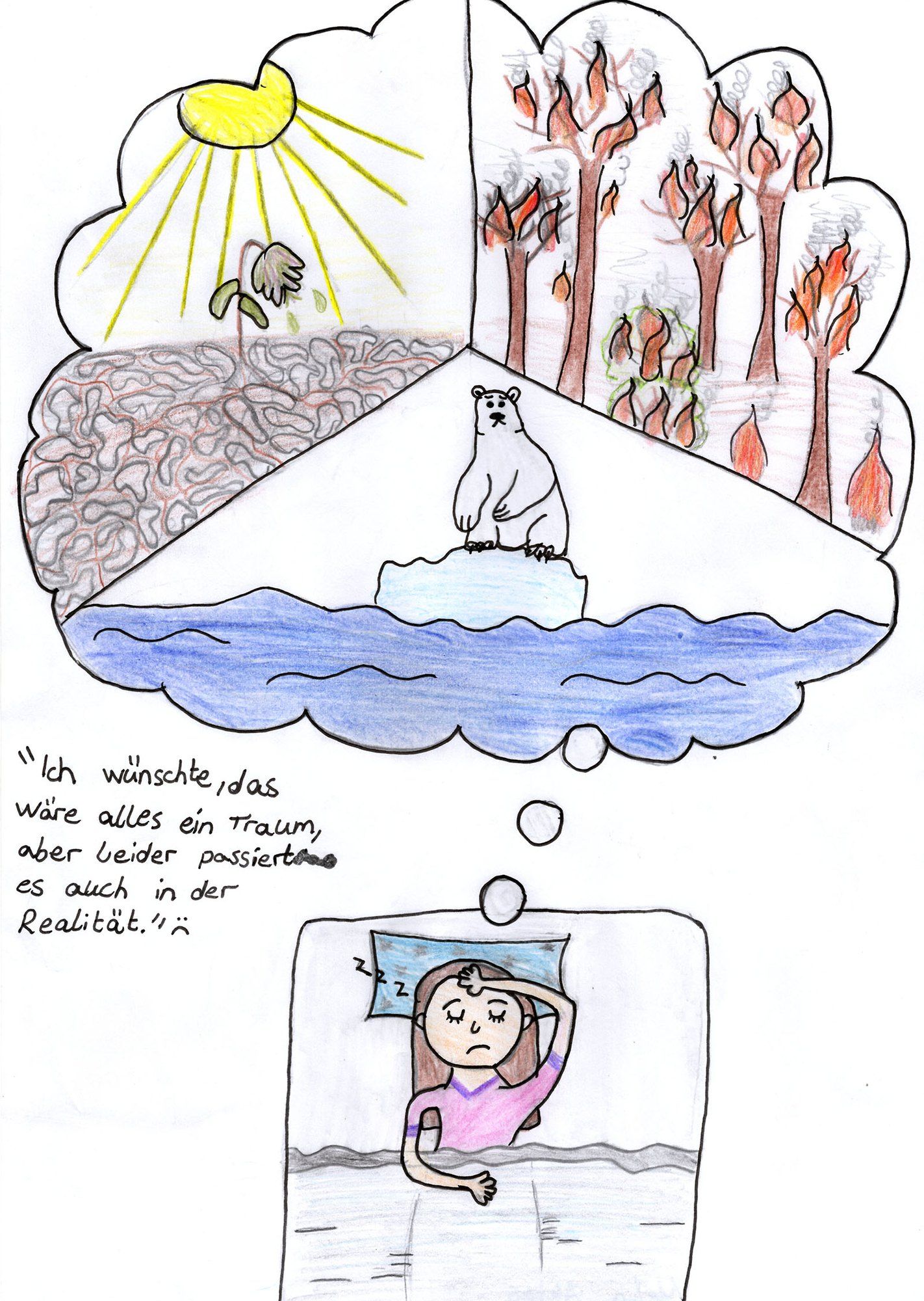 Melin: Ich habe überlegt und mir vorgestellt wie die Klimaveränderung auf uns alle wirkt und dann das Bild gemalt. Danach hoffte ich es wäre nur ein Traum, leider wohl nicht.