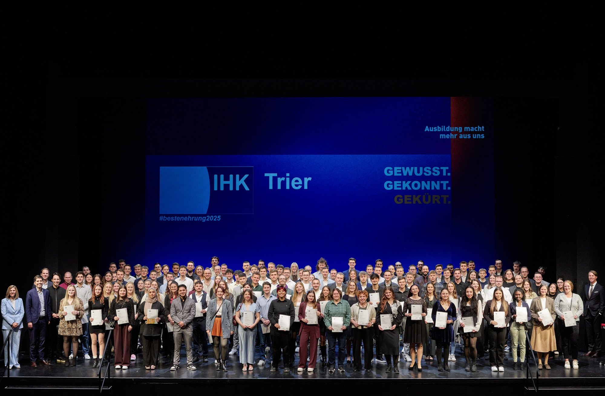 Die IHK Trier hat die Top-Absolventen des Jahrgangs 2025 im Theater Trier gefeiert. 166 Auszubildende und die zwölf besten Absolventen der Höheren Berufsbildung erhielten ihre Abschlusszeugnisse und wurden für herausragende Leistungen geehrt. Dank eines Livestreams konnten auch Familien und Freunde die Veranstaltung verfolgen. Das Theater Trier sorgte mit Beiträgen aus seinem aktuellen Programm für kulturelle Unterhaltung.