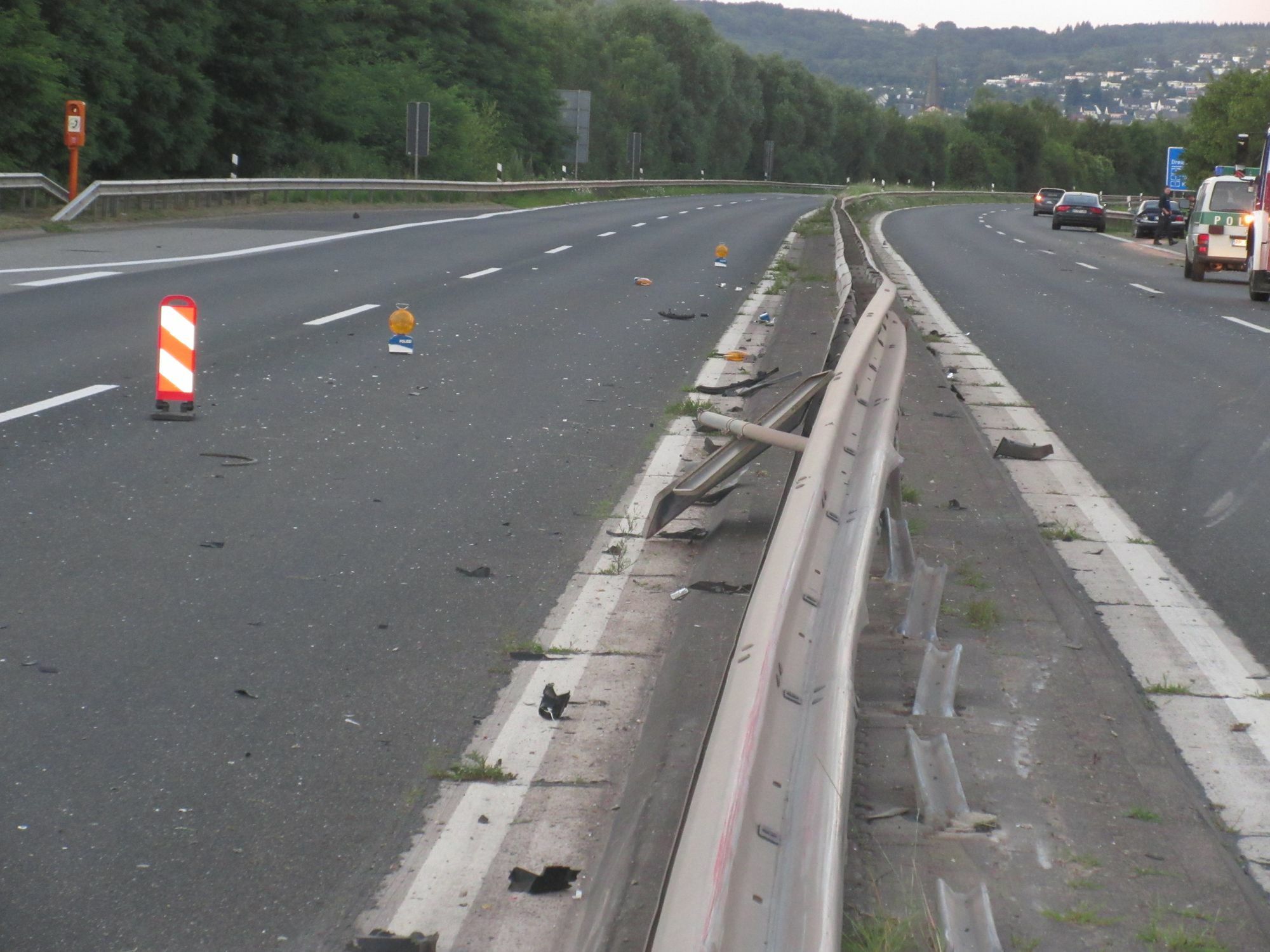 Die Schadensbilanz des Abends: Zwei schrottreife Pkw mit einem Gesamtschaden von 15.000 Euro und 95 Meter beschädigte Schutzplanken im Wert von 5000 Euro. Zudem wurde die Beifahrerin des Unfallverursachers leicht verletzt und mit einem Rettungswagen ins Krankenhaus eingeliefert. Im Einsatz waren die Berufsfeuerwehr Trier, ein Rettungswagen, die Autobahnmeisterei Schweich, zwei Abschleppunternehmen sowie zwei Streifen der Polizeiautobahnstation Schweich.