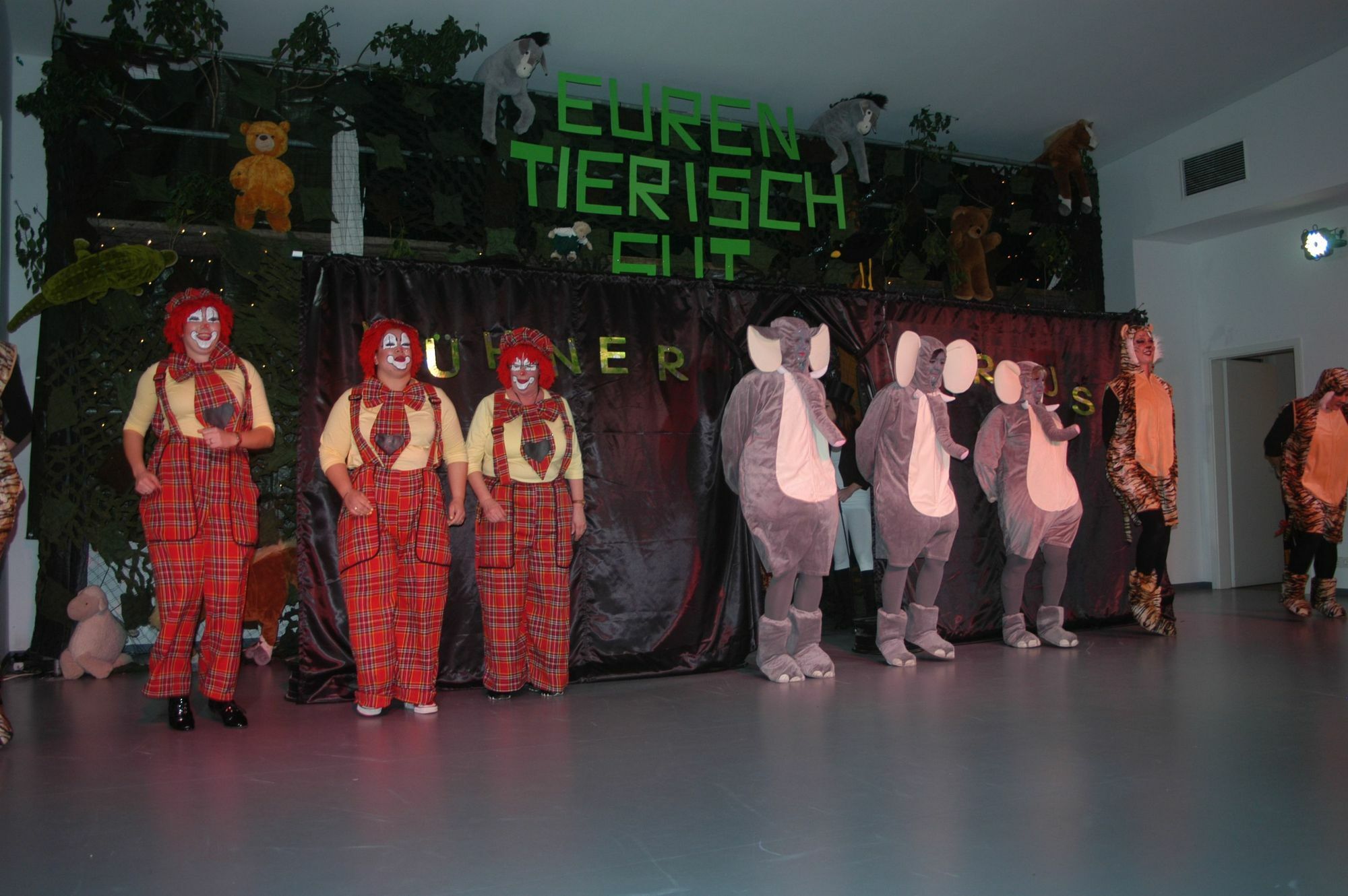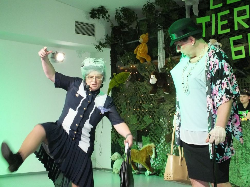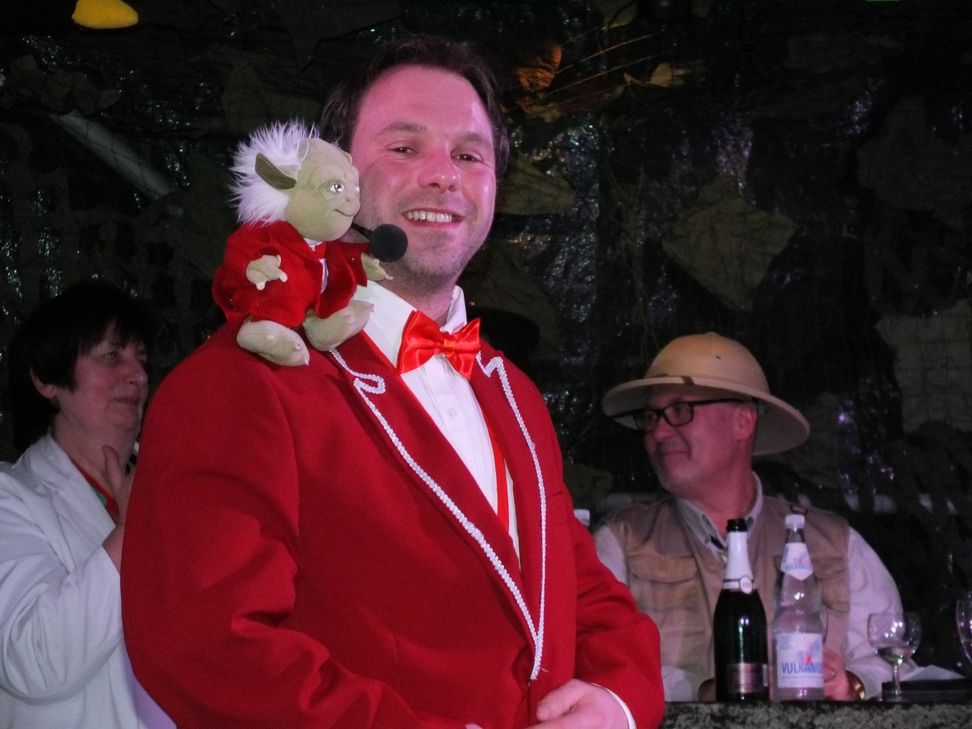Zebras, Elefanten und andere exotische Tiere bevölkerten die Bühne. Aber auch andere ungewönliche Wesen, wie der kleine Yoda aus dem Film "Star Wars", ließen das Publikum aus dem Lachen nicht mehr herauskommen. Er hockte auf der Schulter von Thomas Koltes. Der kleine Yoda musste sogar arbeiten. Als er keine Lust mehr dazu hatte, riss er einfach die Lampe heraus. Im Dunkeln lässt sich schließlich schlecht arbeiten. Pastor Franz-Josef Hohn unterhielt die Narren mit viel Selbstironie. Für ebenso viele Lacher sorgte Büttenrednerin Elke Metzen als letzte deutsche Putzfrau von der Autobahn. Gegenseitig nahmen sich bei der Bütt "Erna und Felicitas" Ute Stoffels und Jörg Fuchs auf die Schippe. "Meine Figur ist nur durch Sport entstanden" - "Vielleicht durch Ritter Sport". Traditionell durften natürlich auch die Koobensänger nicht fehlen. Bei den "Verrückten Hühnern" fand man sich plötzlich in der Circusmanege mit vielen wilden Tieren wieder. MG, Fotos: Greve