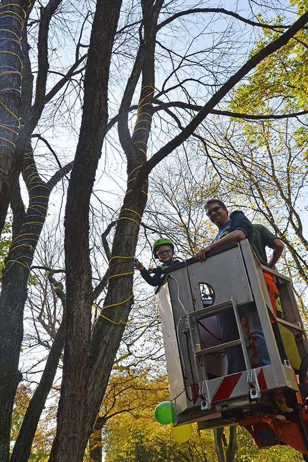 Jetzt ist endlich Julius dran: Mit seinem Papa steigt er in den Hubsteiger und fährt einige Meter hoch in die Luft, wo er seinen Nuckel an den Stamm des Kuchenbaums hängt. Seinen Namen verdankt dieser übrigens dem nach Kuchen riechenden Laub im Herbst. Traurig ist Julius – ebenso wie Felix – nicht, als er seinem Schnuller Tschüss sagt, im Gegenteil: Die Freude über die spannende Aktion steht beiden ins Gesicht geschrieben. Nur der kleine Nils kann sich nicht so recht mit dem lauten Gerät anfreunden. Einladungen von seinen vier Großeltern, mit ihnen in den Hubsteiger zu kommen, schlägt er mit Kopfschütteln aus, sodass kurzerhand seine beiden Opas in die Luft gehoben werden und den Schnuller des Enkels aufhängen. Eine persönliche Urkunde erhält Nils – ebenso wie alle anderen Kinder an diesem Nachmittag – natürlich trotzdem, selbstverständlich versehen mit dem offiziellen "Schnullerstempel" der Stadt Trier.