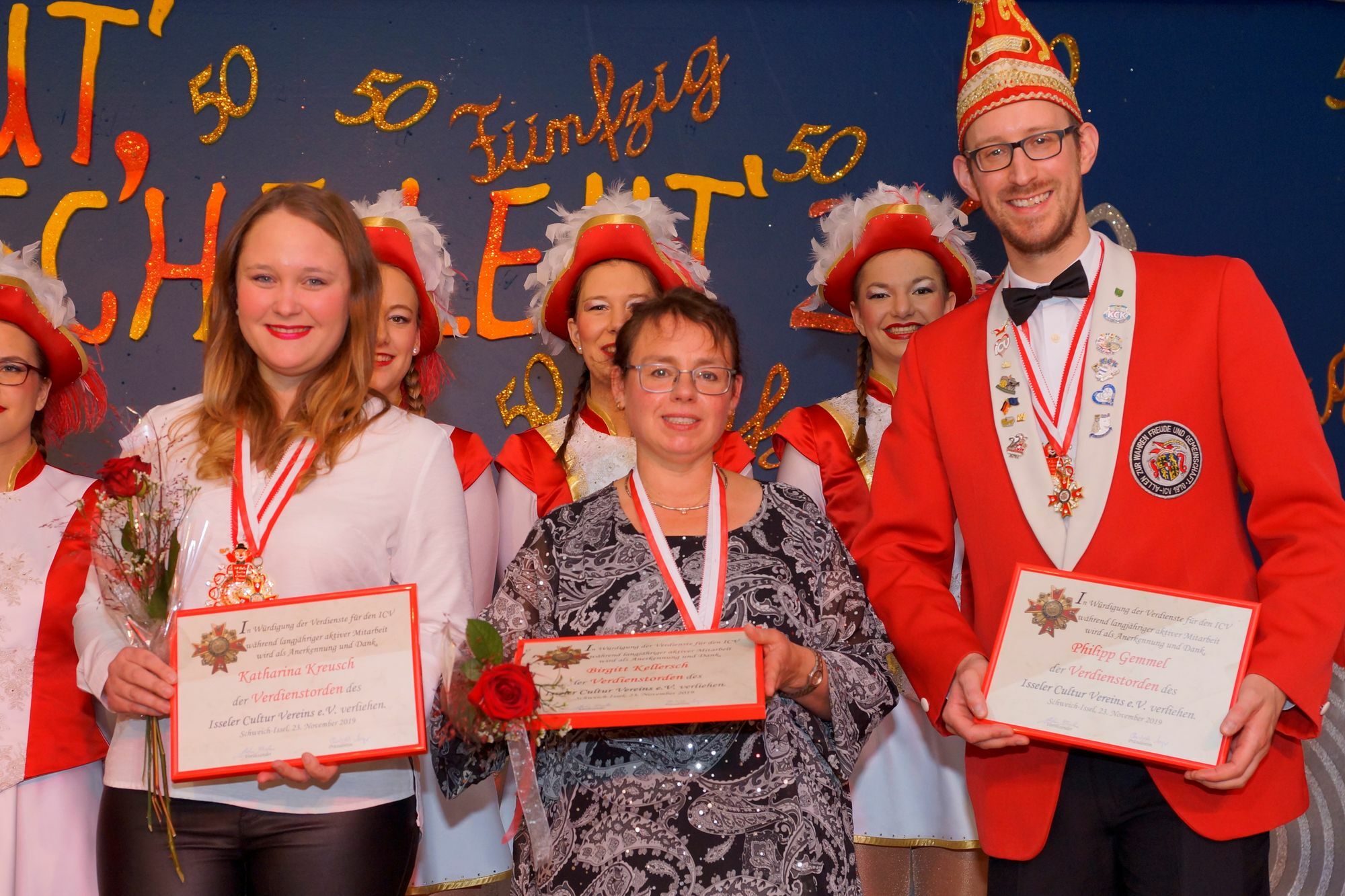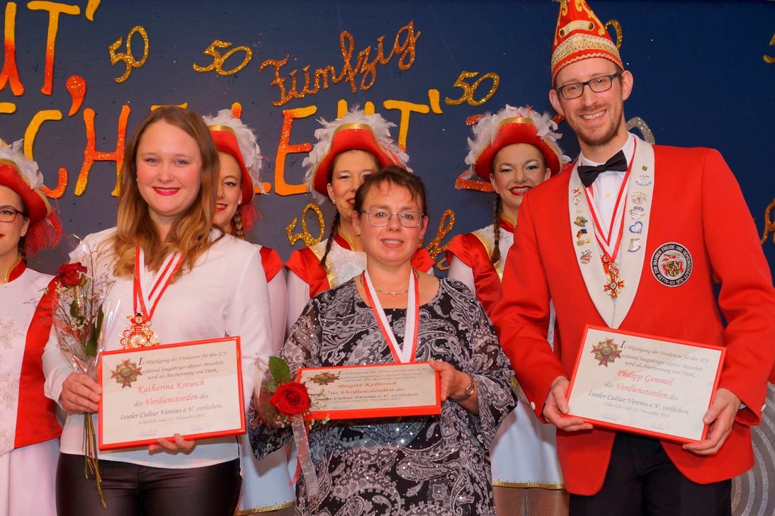 Mehr als 400 Karnevalisten aus nah und fern waren in Issel zugegen, um dem Jubilar ihre Aufwartung zu machen. Unter den Gästen waren zahlreiche Vertreter befreundeter Gastvereine sowie der Kommunalpolitik. Von Anfang an herrschte beste Partystimmung in der proppenvollen Narrhalla, in der Sitzungspräsidentin Elisabeth Mezger, unterstützt von ICV-Kapitän Stefan Becker, einen kurzweiligen Abend moderierte. Den musikalischen Rahmen lieferte die ICV-Hausband ("Happy-Music"). Nach dem Einzug des Vorstandes mit Elferrat und noch amtierenden Prinzenpaar Jan Wollscheid und Maria Berg, stellte Becker auf humorvolle Weise den schmucken Jubiläums-Sessionsorden vor und erläuterte das zum Vereinsjubiläum passende Sessionsmotto. Dass der ICV trotz seiner 50 Jahre alles andere als eine verstaubte Gesellschaft ist, bewiesen vor allem die Show- und Gardetanzdarbietungen der Jugend- und der Prinzengarde sowie des Männerballetts ("Asseler Schneeflöckchen"). Dies zeigt, dass ein Schwerpunkt der Isseler Karnevalisten bei der Jugendarbeit liegt. Aber auch die älteren Aktiven des ICV waren nicht untätig: Die Gruppe der "reiferen" Gardemädchen ("Special Guest's") begeisterte mit einem Queen-Medley als rockige Ladys. Neben dem Sessionsorden wurden zudem auch Orden für besondere Verdienste verliehen: Philipp Gemmel, Birgit Kellersch und Katharina Kreusch erhielten jeweils für ihre 11-jährige aktive Vereinsarbeit den ICV-Verdienstorden. Eine ganz besondere karnevalistische Auszeichnung gab es für Eberhard Speicher. Von dem Präsidenten des Bundes Deutscher Karneval im Landesverband Rhein-Mosel-Lahn Peter Pries, der in Begleitung weiterer BDK-Vertreter nach Issel angereist war, wurde er für seine mehr als 25-jährgie Vorstandsarbeit mit dem Verdienstorden des Bundes Deutscher Karneval (BDK) in Gold geehrt. Ihr neues Prinzenpaar werden die Asseler Narren am 11. Januar 2020 bei ihrem traditionellen Dämmerschoppen inthronisieren. Weitere Informationen zu Terminen, Veranstaltungen und anderem närrischen des Vereins gibt es hier. RED, Fotos: Verein