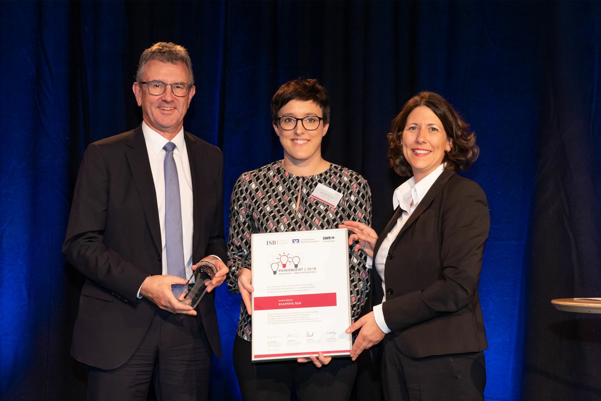 Den mit 15.000 Euro dotierten ersten Platz eroberte Gerüstbaumeisterin Jeanette Spanier von der Scaffeye GmbH aus Longuich für sich, die traditionelle Handwerkskunst durch den Einsatz digitaler Mittel sicherer und effizienter macht. Durch die Geschäftsidee der jungen Gerüstbaumeisterin können der Aufbau und die Sicherheit von Gerüsten digital erfasst, überprüft und verwaltet werden. "Das Beispiel der Scaffeye GmbH zeigt, wie digitale Elemente dazu eingesetzt werden können, Prozesse zu optimieren und traditionelle Handwerkskunst exakt an die Bedürfnisse der Anwender anzupassen", führte Ulrich Dexheimer, Sprecher des Vorstandes der ISB, die Entscheidung der Jury für das Unternehmen aus. "So werden Kosten verringert, während Sicherheit, Transparenz und Kommunikation auf dem Bau deutlich steigen."