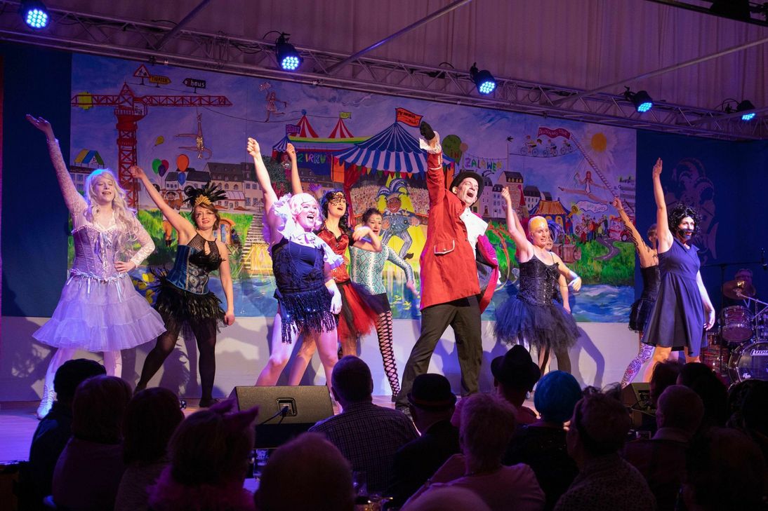 Wunderschön geworden ist die "Clown-Parade", der Tanz der Minigarde, ihres Zeichens die jüngsten Tänzerinnen des Vereins. "Der Domteur", alias Constantin Albert, berichtete über seine Zeit als Aushilfsdompteur und seiner unheimlichen Begegnung mit Frau Tausendschön. Nur weil er den Kellerschlüssel verloren hatte, spach seine Ehefrau nicht mehr mit ihm, klagte der "Dumme August" (Josef Müller) und konnte das gar nicht nachvollziehen. Ob eine Einladung zum Essen das Eheglück retten konnte? Retten musste man beim Schautanz "The greatest Showman" definitiv nichts mehr. Energiegeladen und ausdrucksstark präsentierte die Gruppe unter der Leitung von Oliver Hofmann einen grandiosen Tanz und erntete dafür die ersten Zugabe-Rufe des Abends. Der größte Magier aller Zeiten zeigte nun sein Können. Doch was ist da passiert? Falsches Kostüm erwischt oder gar die falsche Veranstaltung? Was hatte Rhabarber-Barbara, die Barbaren mit ihrem Bärten und Wirtin Bärbel aus der Bierbar damit zu tun? Antje Gieche und Johannes Mayer zeigten sich in ihrem Vortrag nicht nur als phantastische Redner, sondern auch als echte Verwandlungskünster. Gisela Bitdinger und Claude Weber überzeugten mit ihrem gesanglichen Vortrag "Frau aus der Tingel-Tangel-Schau". Doch zu einem Zirkus gehört noch mehr. Zum Beispiel ein "Kalfakter" alias Sitzungspräsident Jürgen Jakobs. Als Mädchen für alles war er für den Unterhalt des Zirkuszeltes verantwortlich. "Er braucht kein Diplom für das Haus, was aber hilft, ist ein groß Baus." Und dann war er wieder da - den greilischen Vuugel - immer noch auf der Suche nach Arbeit und einer Heimat. Und da man im Zirkus und im Karneval bekanntlich eine große Familie ist, ließen die Aktiven der Wieweler nichts unversucht um dem "greilischen Vuugel" eine Heimat und passende Arbeit zu geben. Doch auch der zweite Versuch scheiterte. Unentschieden ging jedoch das "Wieweler Dance Battle" zwischen Elferrat und ExGarde aus. "Die fliegend' Gaortenmoog von Zalawen" (H.-K. Meunier) entpuppte sich als der Star auf dem Trapez. Bevor sich ein cleverer Elefant und ein dummes Kamel (J. Ahrweiler/ O. Hoffmann) über den Unterschied zwischen Kamel, Lama und Dromedar lustig machten, zeigte die Wieweler Garde ihren Gardetanz. An eine Pferdedressur versuchte sich das Duo "Dröpps und Trilles" nur weiß jeder, der sie kennt, das konnte nicht gut gutgehen. Aber wie ging es dem "greilichen Vuugel"? Es wären nicht die Wieweler, wenn es nicht am Ende gut gehen würde. Im dritten Teil der Schaudarbietung, der bunt gemischten Gruppe aus alt und jung, erkannte man dann doch die wahre Begabung des "greilichen Vuugel" und er entpuppte sich als wahres Talent in einer rosaroten Gruppe. Wahre Talente sind auch die Zalawener Duckentchen die mit ihren Liedern zum Finale noch einmal für richtige Stimmung sorgten. Denn eins ist sicher: Wieweler Nächte sind lang. MV, Fotos: Valentin