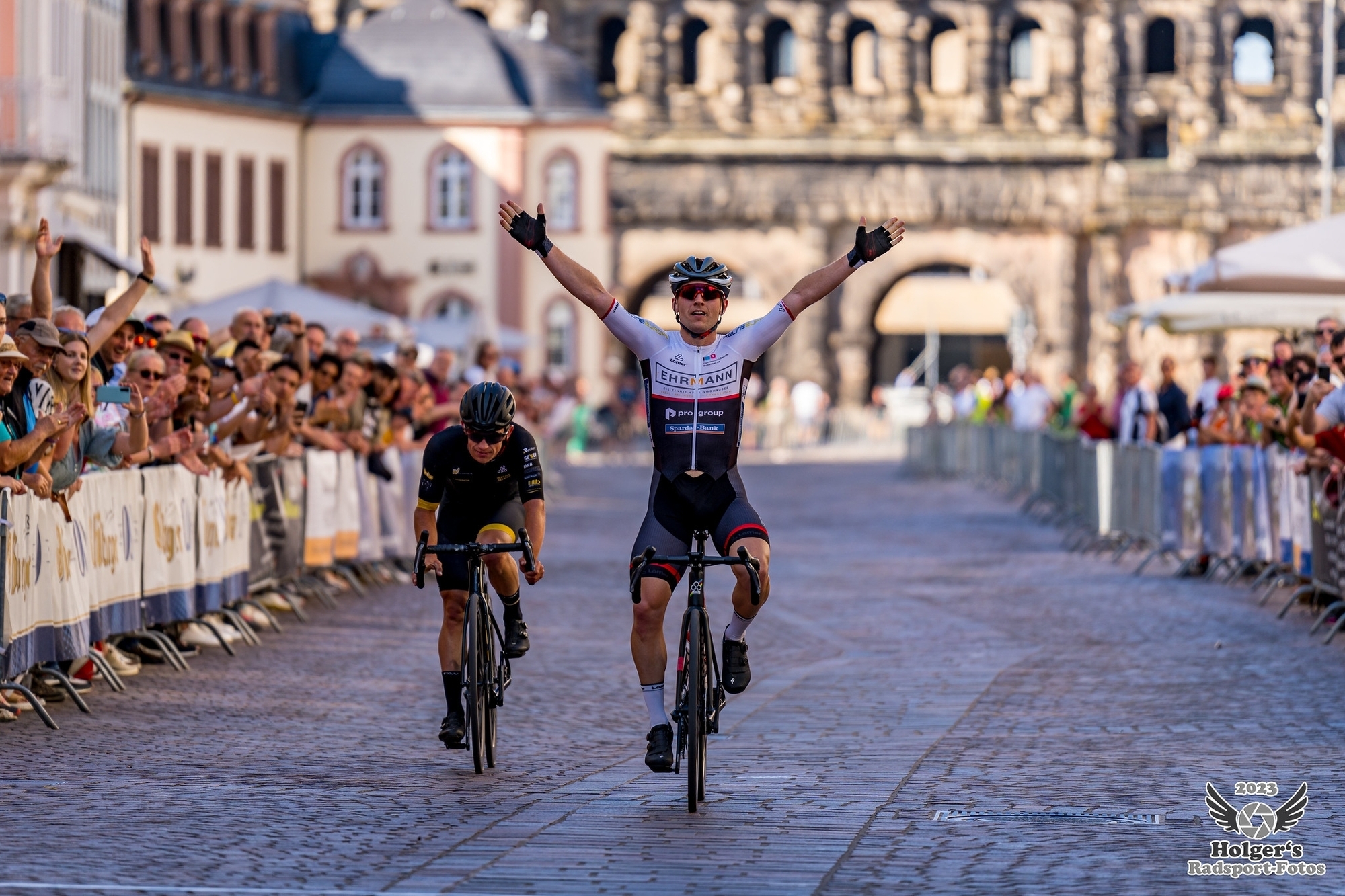 Richtig spannend ging es dann im Rennen der Elite-Amateure zu. Das Hauptrennen über 60 Kilometer versprach mit einem starken Fahrerfeld spannende Taktikkämpfe. Das Rennen zeichnete sich durch einzelne Ausreißversuche, ein großes Hauptfeld sowie die lange Flucht eines alle anderen Fahrer überragenden Duos aus. Nach langer Flucht zu zweit kam es zum superengen Zielsprint zwischen André Schütz vom Skullracing Team sowie Joshua Asel (Team Möbel Ehrmann), der bereits die Erstaustragung des Großen Preis der Stadt Trier am 28. April 2019 im Zielsprint gewann. Nach der letzten Kurve an der Porta lag Schütz noch vorne, Asel sprintete dann auf der langen Zielgeraden über die Simeonstraße aber souverän vorbei und überfuhr als Erster die Ziellinie. So durfte er nicht nur zum zweiten Mal in Trier die Arme jubelnd in die Höhe reißen, sondern auch erneut den umschwärmten Kopfsteinpflasterpokal bei der Siegerehrung gen Himmel heben. Den Zielspurt um den dritten Platz aus dem Hauptfeld gewann Asels Teamkollege Kai Hliza. Den 26-jährigen Schwalbe-Fahrer Marian Pohlenz schlug er damit nur ganz knapp. Die Enttäuschung über den bärenstarken, aber undankbaren vierten Platz stand dem Trierer Radsporttalent nach dem Zieleinlauf ins Gesicht geschrieben.