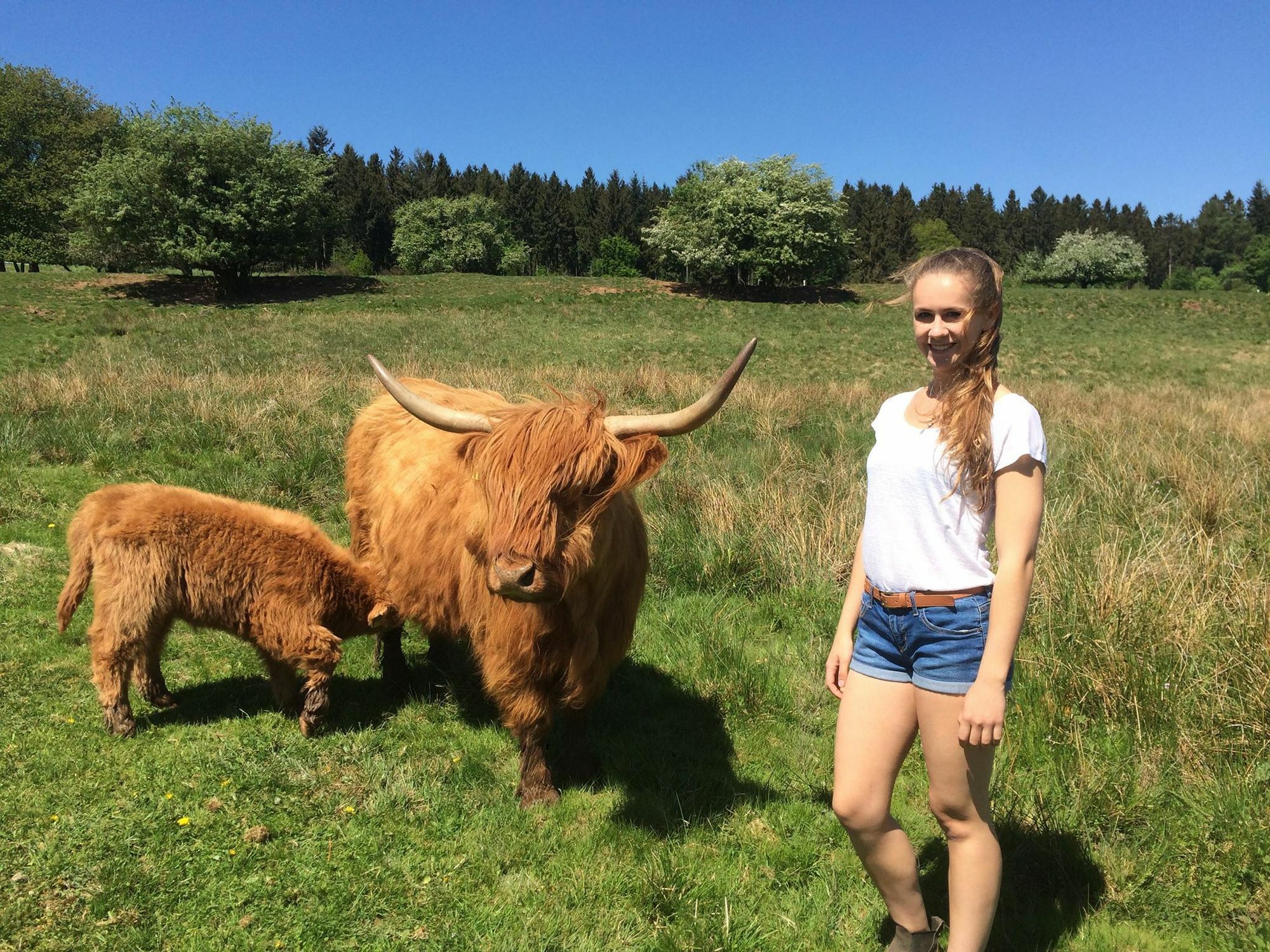 Eigentlich wollte Alisha der kleinen Highland-Dame selbst den neuen Namen ins Ohr flüstern. Doch da war nichts zu machen. Goldie, so ihr neuer Name, ließ sich einfach nicht davon abhalten, sich an Mama Ellys Milchbar den Bauch beziehungsweise den Pansen vollzuschlagen. Anders als in der Milchkuhhaltung wächst das Kalb bei seiner Mutter auf. Kühe sind sehr soziale Wesen. So stehen die neuen Mütter immer zusammen, während ihre Kälber miteinander herumtollen. Viele Kühe sind anhängliche Tiere von tief greifender Loyalität gegenüber ihren Familien. Durch ihre Körperhaltung und ihre Stimmlaute können sie eine ganze Palette an Emotionen auszudrücken, einschließlich Zufriedenheit, Interesse, Wut und Leid. "Diese sanften Tiere trauern, wenn jemand gestorben ist, den sie liebten, und können sogar Tränen über dessen Tod vergießen", da ist sich die Tochter aus dem Hobby-Zuchtbetrieb ganz sicher. Sie selbst hat das schon gesehen, wenn ein Kälbchen tot geboren wurde. "Das kommt aber nur sehr selten bei uns vor", sagt sie. Rinder haben ein grundlegendes Bedürfnis nach Körperkontakt. Sie lassen sich gern striegeln und genießen es, wenn sie gestreichelt werden. Rinder sind Herdentiere und leben in Herden von 20 bis 50 Tieren unterschiedlicher Altersstufen. Angeführt wird die Herde meist durch eine erfahrene ältere Leitkuh, der Bulle übernimmt Verteidigungsaufgaben. Jüngere Kälber leben so wie Goldie im Kälber-“Kindergarten“, jugendliche männliche Tiere am Rand der Herde oder in Junggesellenverbänden. Durch gegenseitiges Lecken, Reiben, Berühren und Beriechen werden die Bindungen zwischen den Tieren bestärkt. FIS