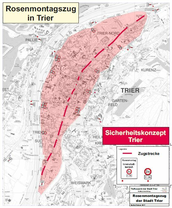 "Auch wenn uns aktuell keine Erkenntnisse oder Hinweise für eine konkrete Gefährdung vorliegen, gilt es weiterhin, einer hohen abstrakten Gefahr gerecht zu werden", sagte Landesinnenminister Roger Lewentz am Montag vergangener Woche. "Der schlimme Anschlag auf den Weihnachtsmarkt hat erneut verdeutlicht, wie groß die Herausforderungen sind und welches hohe Maß an Einsatzbereitschaft und Engagement speziell von den Polizeibeamten verlangt wird", betonte er. Vor dem Hintergrund dieser Ereignisse gilt am Rosenmontag rund um die Strecke des Trierer Karnevalsumzugs in der Innenstadt von 11 bis maximal 18 Uhr ein Ein- und Durchfahrtsverbot für Fahrzeuge ab 3,5 Tonnen. An Weiberfastnacht wird die Polizei die Zufahrten zum Trierer Hauptmarkt an sechs Stellen sperren, um Fahrzeuge aus Sicherheitsgründen zu kontrollieren bzw. das Einfahren zu unterbinden. Für die übrigen Bereiche der Fußgängerzone gelten die regulären Lieferzeiten.