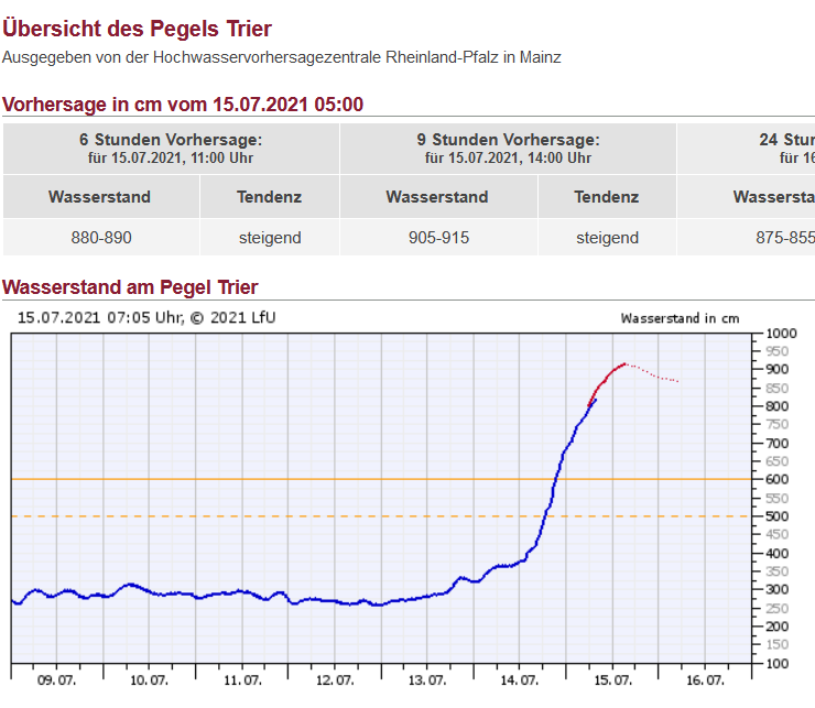 Nach den gestrigen starken Regenfällen ist die Lage im nördlichen Kreisteil von Trier-Saarburg weiterhin sehr ernst. Nach wie vor gilt Alarmstufe 5. Der Krisenstab des Kreises koordiniert seit gestern Abend die umfangreichen und schwierigen Einsätze im Kreis. Einsatzschwerpunkt ist aktuell die Südeifel. Kordel ist momentan von der Außenwelt abgeschnitten. Die Kyll steigt ebenso wie die Sauer weiter stark an. Die Evakuierung des Altenheims Kordel und eines Teils des Ortes läuft seit der Nacht. Die Seniorinnen werden ins Mutterhaus Ehrang gefahren. Wasserfeste Fahrzeuge der Bundeswehr sind im Einsatz. Das Bürgerzentrum Schweich wurde als Sammelstelle für evakuierte Personen eingerichtet. In Kordel und anderen Ortschaften ist seit gestern der Strom ausgefallen. Die Pumpen des Hauptwasserbehälters der Trinkwasserversorgung in der VG Trier-Land sind ausgefallen. Hier wird mit Hochdruck an der Sicherstellung der Trinkwasserversorgung gearbeitet. Die Bevölkerung wird aufgerufen, sparsam mit dem Trinkwasser umzugehen! Inzwischen werden auch aus anderen Orten wie Ralingen Überflutungen gemeldet. Im Einsatz sind Einsatzkräfte der Feuerwehren, des THW, DRK, DLRG, Malteser Hilfsdienst und Bundeswehr. Momentan sind keine Personenschäden bekannt. Die Lage ist weiterhin ernst und dynamisch. Vor allem die Abflüsse der Eifel steigen weiter stark an.