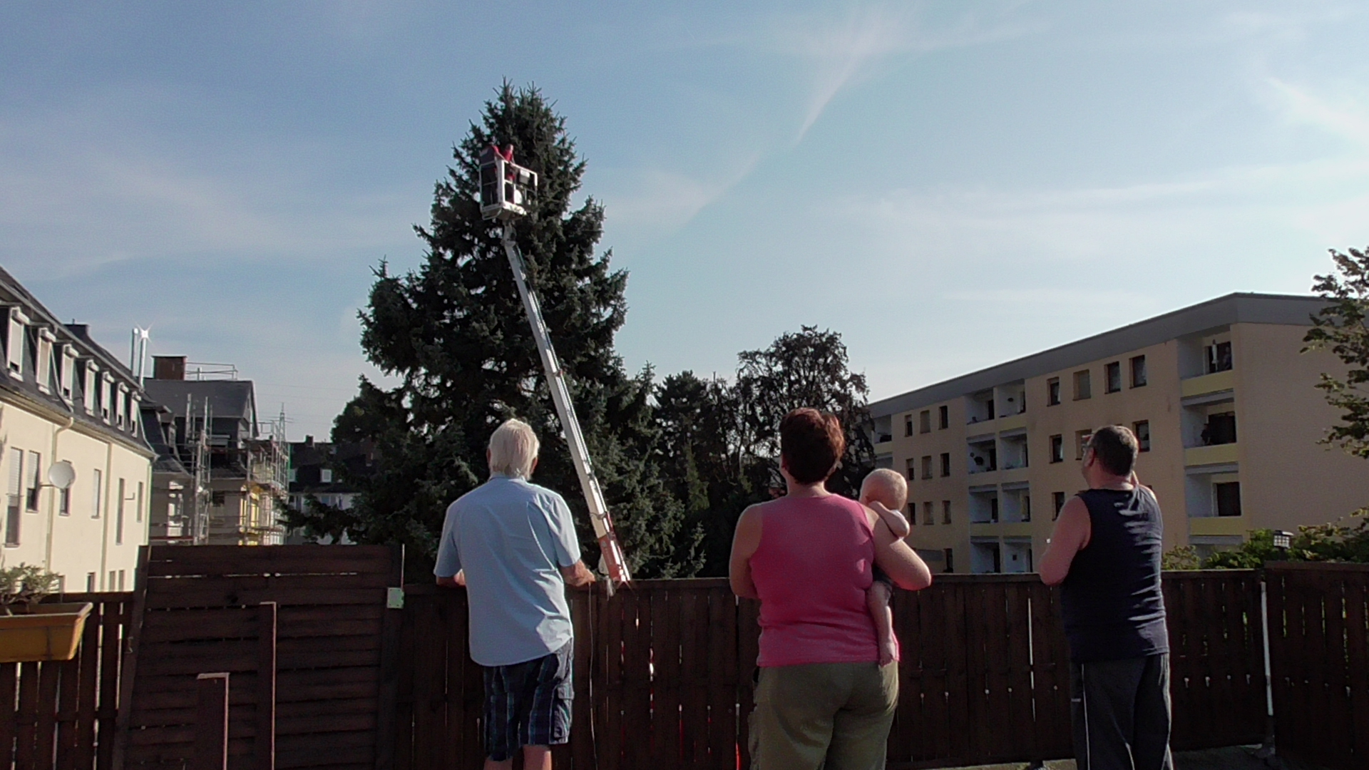 Im Garten fanden sich zwischenzeitlich zahlreiche Menschen ein, um die Katzenrettung zu beobachten. Mit zwei Hebelbühnen versuchen die Mitarbeiter der Firma Seeger "Paul" einzukesseln und dann zu fangen. Doch der Angst. Er klettert allerdings Ast für Ast nach unten. Schließlich erreicht "Paul" eine Höhe, von der er auf die Wiese springen konnte. Er flüchtete sich in den Keller des Hauses. Drei Personen konnten in schließlich einfangen. "Paul" ging es augenscheinlich gut. Er war allerdinsg sehr abgemagert. Ein Mitarbeiter der Firma Seeger nahm sich seiner an und fuhr ihn zum Tierarzt. Alle Anwesenden waren erleichtert, es flossen auch Tränen. Am Ende bedankte sich Manuela Maus für die Hilfe und das Teilen ihres Aufrufs im Internet.