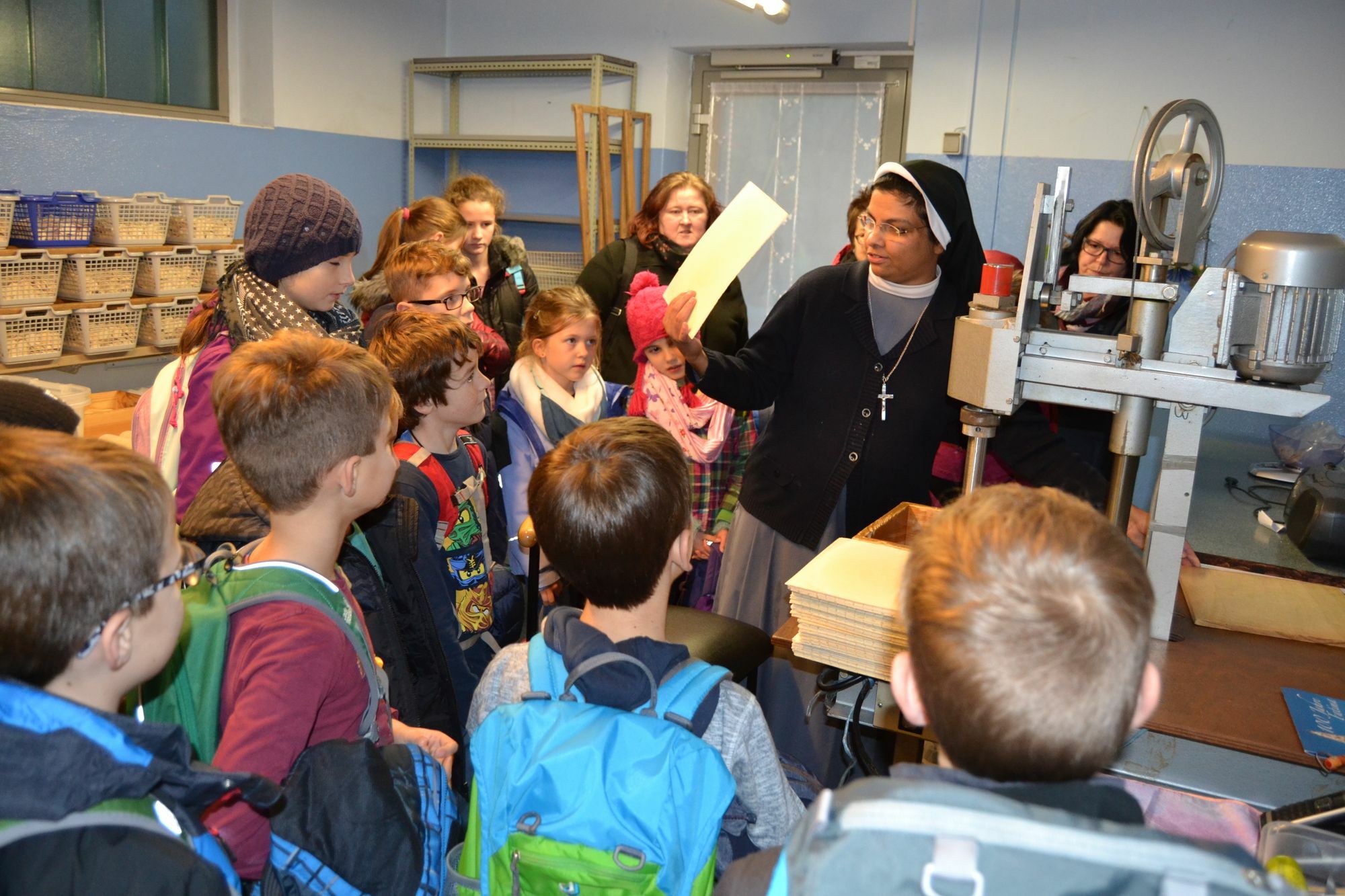 Im Anschluss sind wir in die Hostienbäckerei gegangen. Hier haben wir erklärt bekommen wie man Hostien backt. Der Teig besteht aus Mehl und Wasser, alles ohne Gewürze. Der Teig wird auf Platten gespritzt und bei 174 Grad Celsius gebacken. Danach wird er in einen Kühlraum gebracht. Wenn der Teig die richtige Temperatur hat werden 50 Platten unter eine Stanzmaschine gelegt. Auf die Platten werden nun 50 Kreise gestanzt. Somit sind 2500 Hostien auf ein Mal fertig. Sie müssen nur noch getrocknet werden. Dies dauert ca. 3 Tage. Jedes Kind durfte ein Stück der Hostienplatte probieren. Die Ordensschwester erklärte und zeigte uns, dass es 4 verschiedene Größen von Hostien gibt. Die Größte hat einen Durchmesser von 15 cm.
