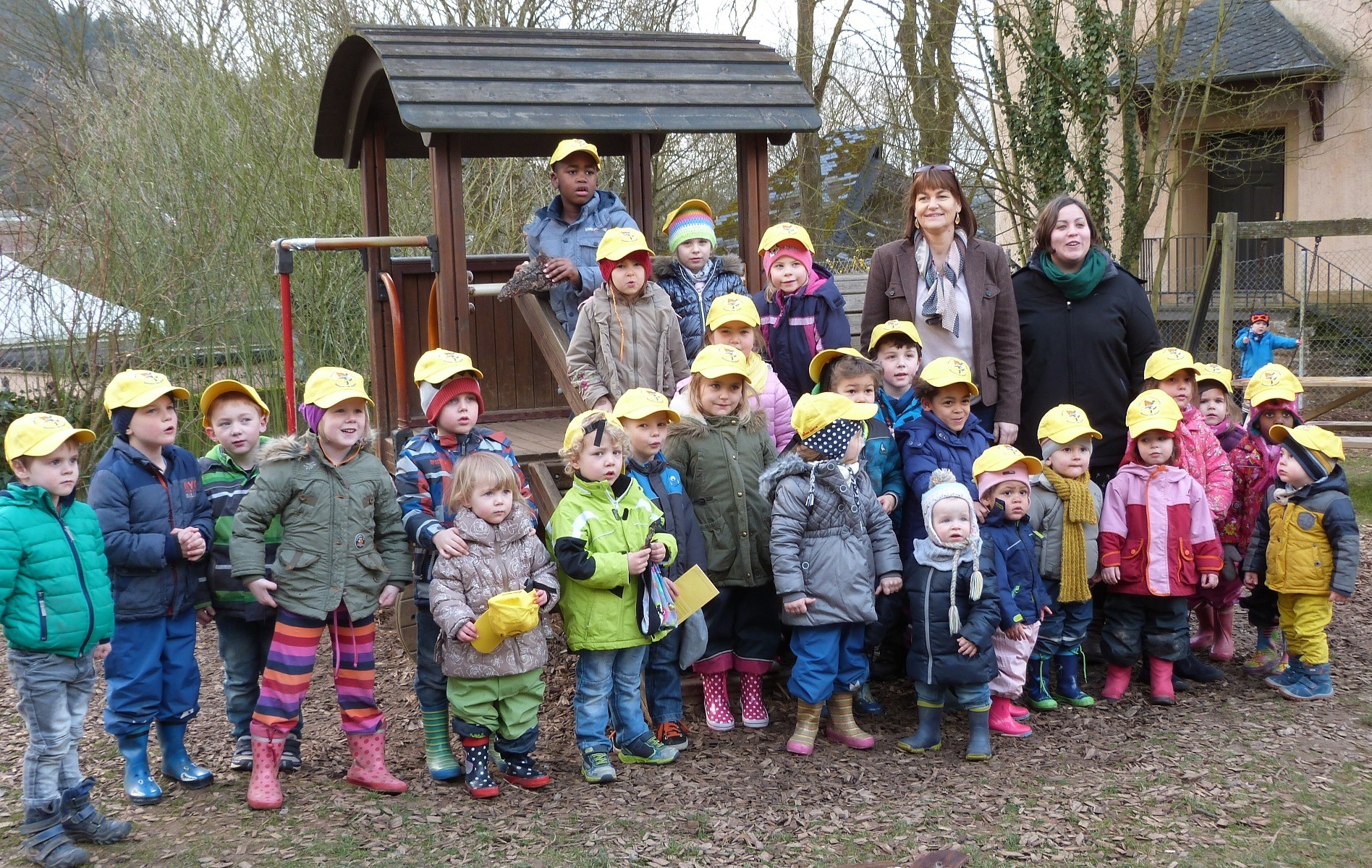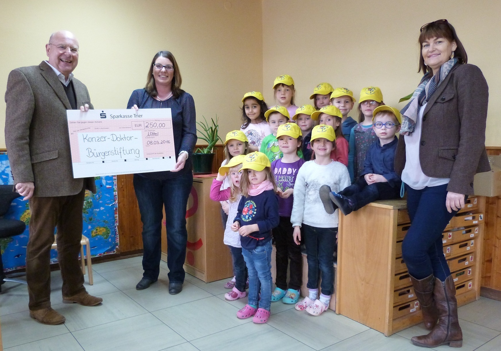 Gleich doppelte Freude herrschte beim Besuch der Kita St. Martin in Nittel. Die Kinder erhielten für ihre Ausflüge 25 leuchtend-gelben Warnkappen mit dem KODO-Logo und die Konzer-Doktor-Bürgerstiftung (KoDoBüSt) einen Spendenscheck über 250 Euro für ihr Flüchtlingsprojekt "Flüchtlingsfrauen mit Kindern sprachlich und kulturell stark machen". Der Förderverein der Kita St. Martin hatte sich entschlossen, einen Teil des Erlöses des Nikolausmarktes für das Flüchtlingsprojekt der KoDoBüSt zu spenden. Sandra Schönhofen, die Vorsitzende des Fördervereins, überreichte den symbolischen Spendenscheck an Hartmut Schwierig, den Vorsitzenden der Stiftung.