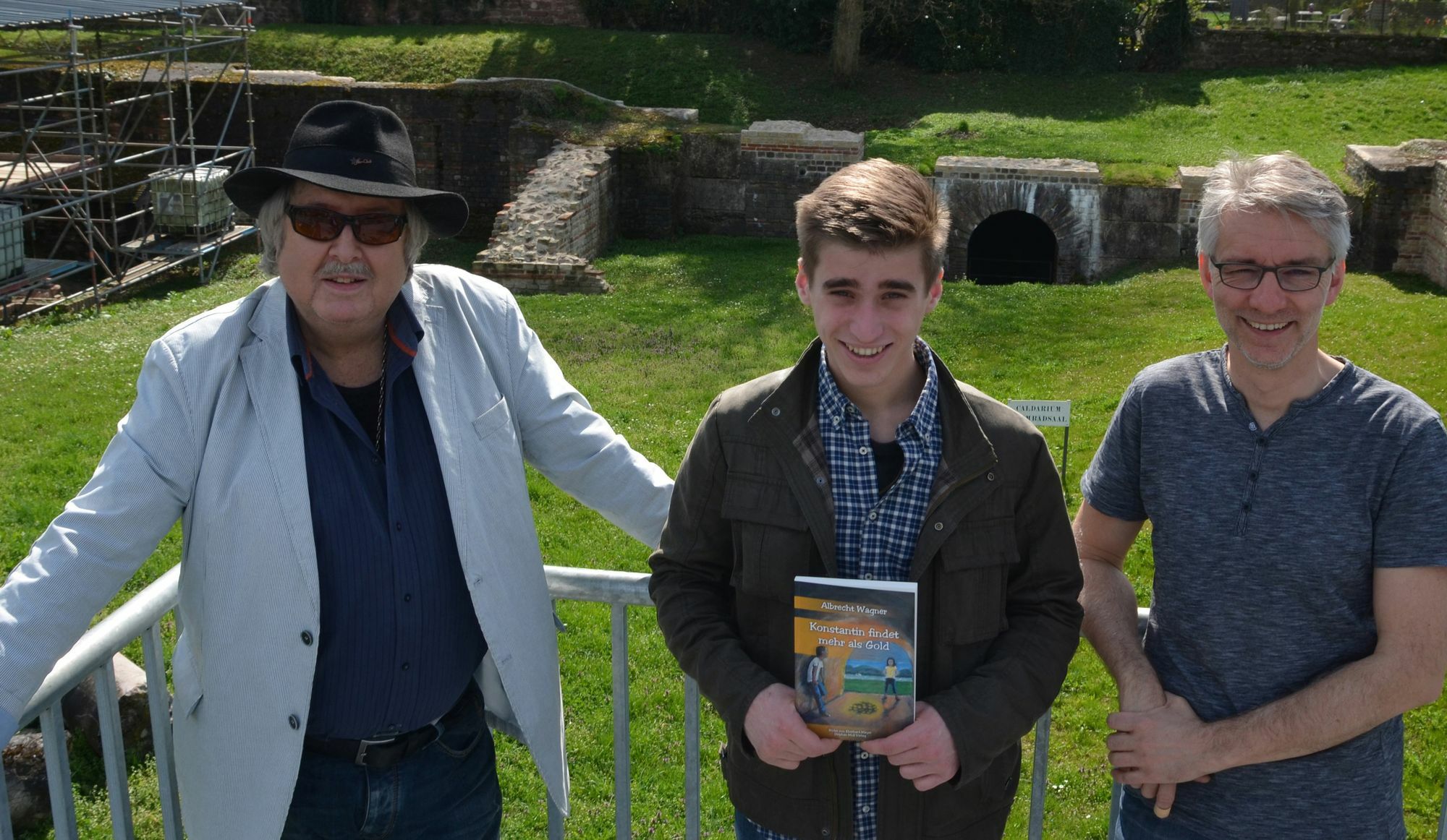 Buchautor Albrecht Wagner (r.) mit Philipp Voigtländer (alias Konstantin) und Sprecher Heribert Schmitt (Harry Hut, l.) stilecht vor römischer Kulisse in den Barbarathermen. Foto: Finkenberg