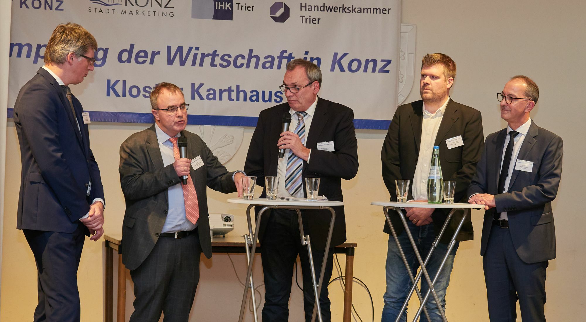 Nach dem Vortrag gab es eine kleine Diskussionsrunde zum Thema Digitalisierung in der Wirtschaft, an der neben Bürgermeister Joachim Weber auch Dr. Matthias Schwalbach (Geschäftsführer HWK Trier), Dr. Jan Glockauer (Hauptgeschäftsführer IHK Trier) und Stephan Holbach (Stadtmarketing Konz) teilnahmen. Moderiert wurde die Talkrunde von Thomas Vatheuer. "Handwerker sind bodenständige Menschen. Wir müssen mit den Grundlagen anfangen. Mit der eigenen Homepage anzufangen ist nicht die schlechteste Idee", sagte Schwalbach. "Man muss sich austauschen. Es gibt keine Lösung aus der Schublad", ergänzte Glockauer.