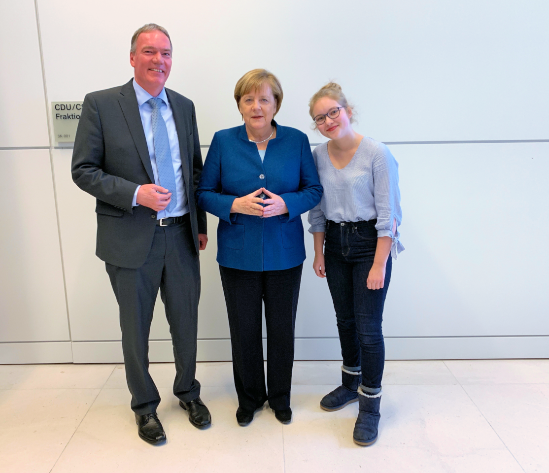 Dabei lernt sie das Parlament kennen, besucht Ausschuss- und Plenarsitzungen und unterstützt das Team von Andreas Steier bei kleineren Aufgaben. Das Highlight: Ein Treffen und Erinnerungsfoto mit der Bundeskanzlerin, Dr. Angela Merkel im Reichstag. "Frau Merkel war sehr freundlich, hat uns alle begrüßt und ein Foto gemacht. Ich fand den Moment aufregend, unserer Bundeskanzlerin 'Hallo' sagen zu können", so Helen Manhart im Anschluss.