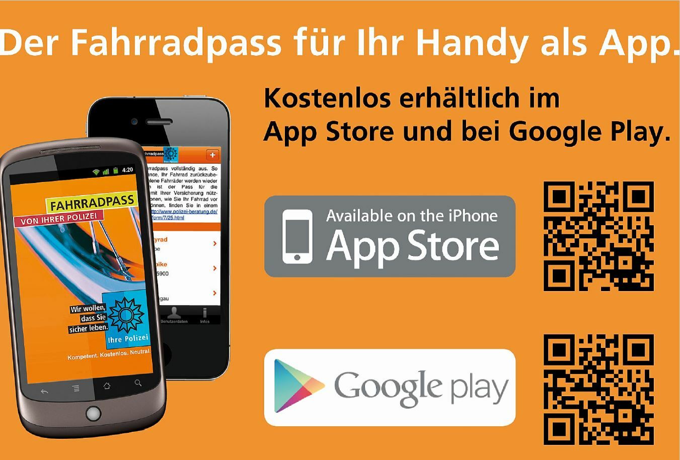 Wer im Besitz eines Smartphones ist, kann die kostenloseApp der Polizei für iPhones und Android-Gerätes nutzen. Sämtliche für die Identifizierung wichtigen Fahrrad-Daten können mit der App problemlos gespeichert werden. Darüber hinaus lassen sich über die App die Angaben mehrerer Fahrräder verwalten. Zudem können die Daten ausgedruckt oder per E-Mail verschickt werden, um sie bei Bedarf sofort an die Polizei beziehungsweise den Versicherer weiterleiten zu können. Der Radbesitzer hat die Daten auf dem Smartphone immer dabei