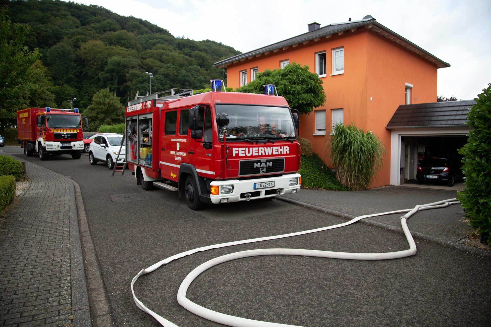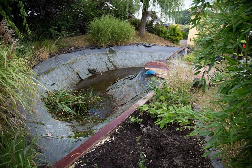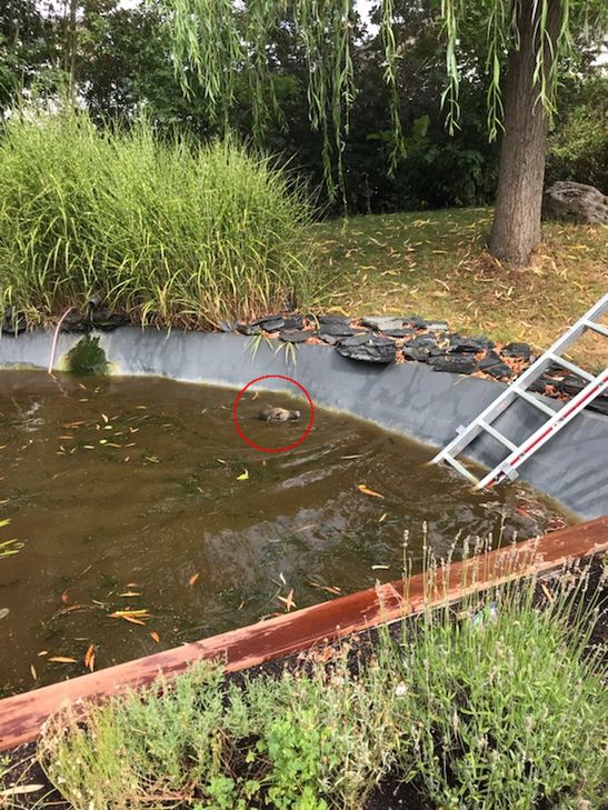 Dort fand sie eine Wildschweinfamilie mit sechs Frischlingen im Teich vor. Die Tiere drohten dort zu ertrinken. Bei den ersten eigenen Versuchen, die Frischlinge zu retten, wurde das Muttertier, welches selbst zunächst nicht aus dem Teich kam, aggressiv. Daraufhin wurde die Feuerwehr alarmiert. Als diese eintraf, hatten sich die beiden erwachsenen Wildschweine bereits selbst befreit. Auch die ersten Frischlingen fanden den Weg aus dem Wasser. Die Tiere verschwanden direkt vom Grundstück durch das Gebüsch. Mit Hilfe der Feuerwehr konnten dann auch die restlichen Frischlingen vor dem Ertrinken gerettet werden. Da nicht ausgeschlossen werden konnte, dass ein Frischling im Teich ertrunken war, wurde dieser leergepumpt. Zum Glück blieb die Suche ohne Ergebnis. Es ist nicht das erste Mal, dass in dem Teich Wildtiere landen. Vor einiger Zeit wurde dort bereits ein ertrunkener Fuchs entdeckt. Nun will die Besitzerin den Teich aufschütten. Fotos: Privat