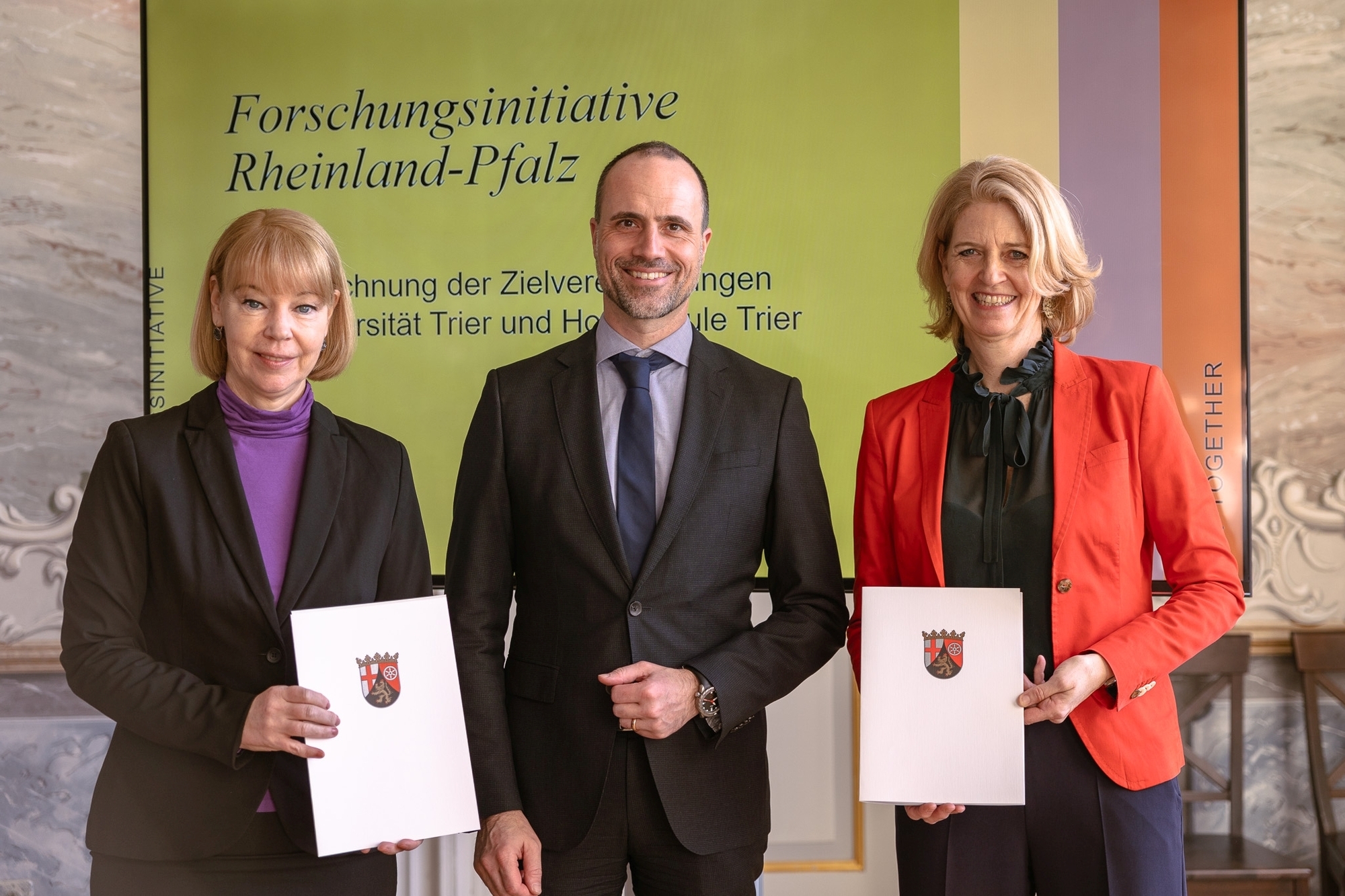 Im Rahmen seiner Forschungsinitiative unterstützt das Land Rheinland-Pfalz wissenschaftliche Vorhaben von Universität Trier und Hochschule Tier. Bis 2028 bekommt die Universität hierfür jedes Jahr 2,1 Mio. Euro, die Hochschule 520.000 Euro. Entsprechende Zielvereinbarungen haben Wissenschaftsminister Clemens Hoch, Universitätspräsidentin Prof. Dr. Eva Martha Eckkrammer und Hochschulpräsidentin Prof. Dr. Dorit Schumann unterschrieben.