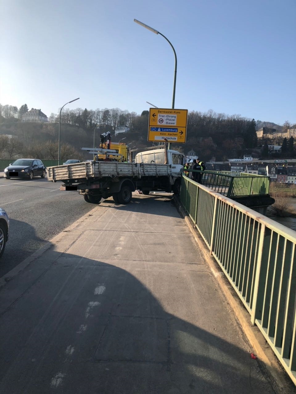 Der Lieferwagen war in Richtung Bitburger Straße unterwegs, als er nach rechts von der Fahrbahn abkam und in das Brückengeländer raste. Fast hätte das Fahrzeug das Geländer durchbrochen und wäre in die Tiefe gestürzt. Ein umherfliegendes Fahrzeugteil traf einen Fußgänger am Kopf und verletzte diesen leicht. An dem Lieferwagen und an der Brücke entstanden großer Schaden. Die Schadenshöhe wird auf 7.000 Euro geschätzt. Der Fahrer des Lieferwagens flüchtete von der Unfallstelle und ließ sein Fahrzeug zurück.