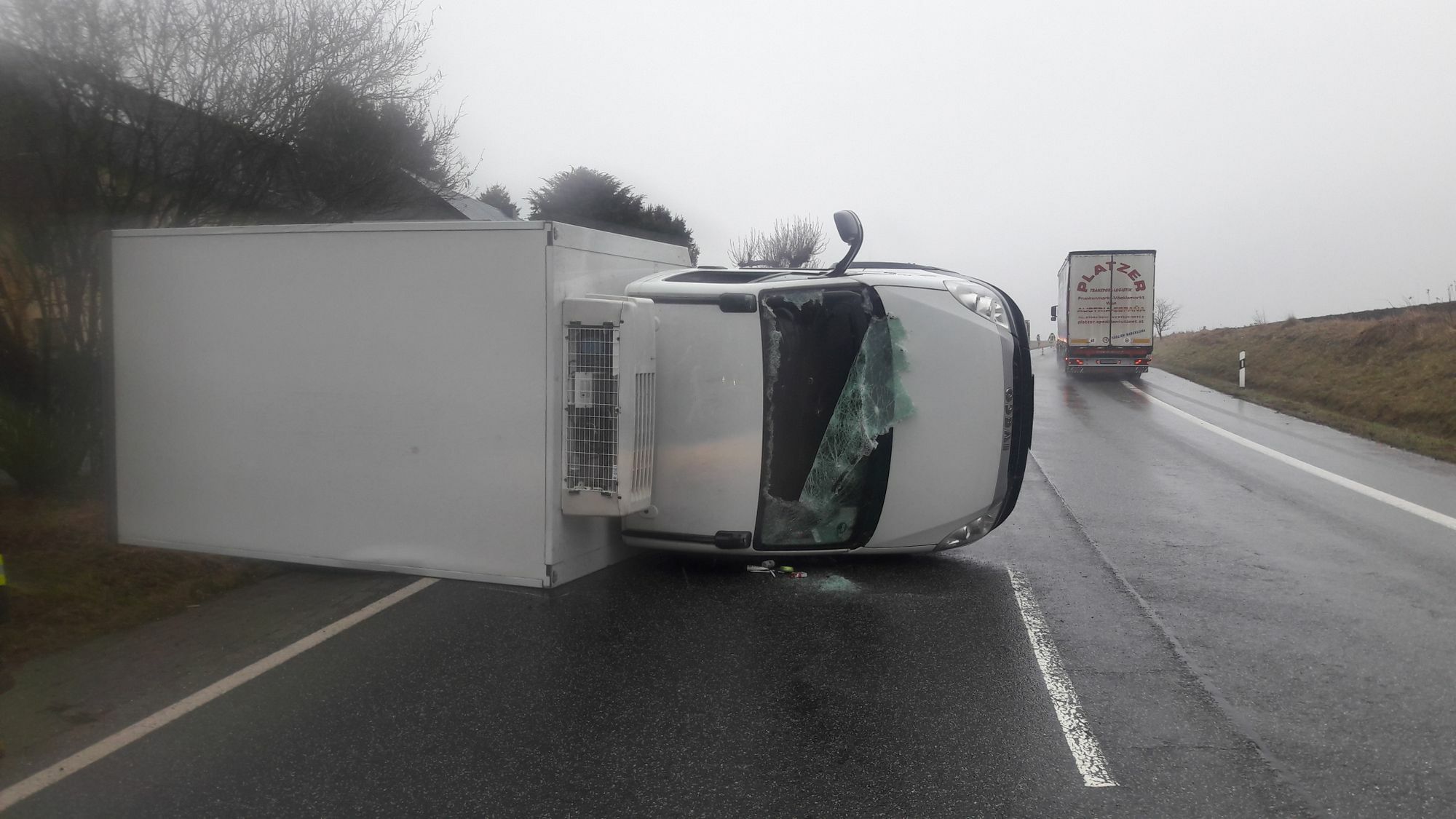 Nach ersten Angaben der Polizei war ein Tiefkühllieferwagen von Trier kommend in Richtung Zerf unterwegs. Vor dem Steinbachweiher in der Nähe von Paschel sei ein 23-Jähriger mit seinem Auto aus bisher ungeklärter Ursache auf die Gegenfahrbahn gekommen und dort mit dem Lieferwagen zusammengeprallt. Dabei kippte der Tiefkühllieferwagen auf die Seite. Der 23-jährige Unfallverursacher wurde leicht verletzt, der Fahrer des Lieferwagens und seine Beifahrerin blieben unverletzt.