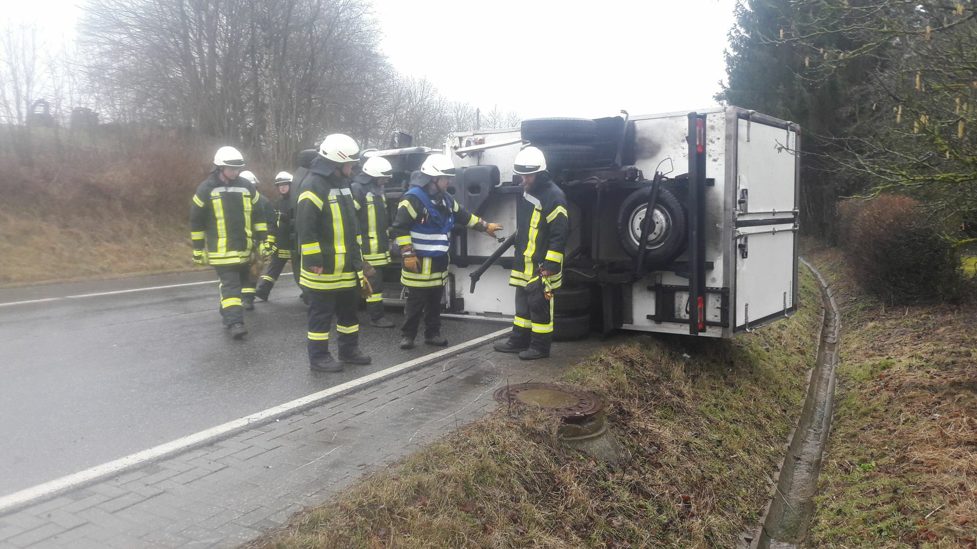 Der Lieferwagen lag quer über der Fahrbahn und musste von einem Kran geborgen werden. Im Einsatz waren die Feuerwehr Zerf, das DRK Zerf, ein Notarzt und die Polizei Saarburg.