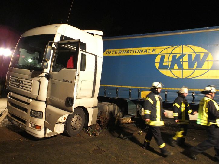 Der 35-jährige Fahrer erlitt einen Schock und wurde vor Ort betreut. Die Feuerwehr sicherte den 40- Tonner ab und pumpte den restlichen Kraftstoff aus dem Tank. An der Kanalisation und der Straße wurde Bindemittel ausgestreut, um die Umwelt zu schützen. Der LKW musste von einem Spezialunternehmen aus Trier geborgen werden. Für die Bergung musste die Feuerwehr außerdem zwei Bäume fällen. Der Einsatz dauert bis weit nach Mitternacht an. Der Sachschaden beträgt nach derzeitigem Stand 20.000 Euro. Die Triererstraße war voll gesperrt. Im Einsatz waren die freiwilligen Feuerwehren aus Aach, Newel und Rodt, Mitarbeiter der unteren Wasserbehörde, ein Abschleppunternehmen aus Trier, die Straßenmeisterei Trier sowie Beamte der Polizeiinspektion Schweich.