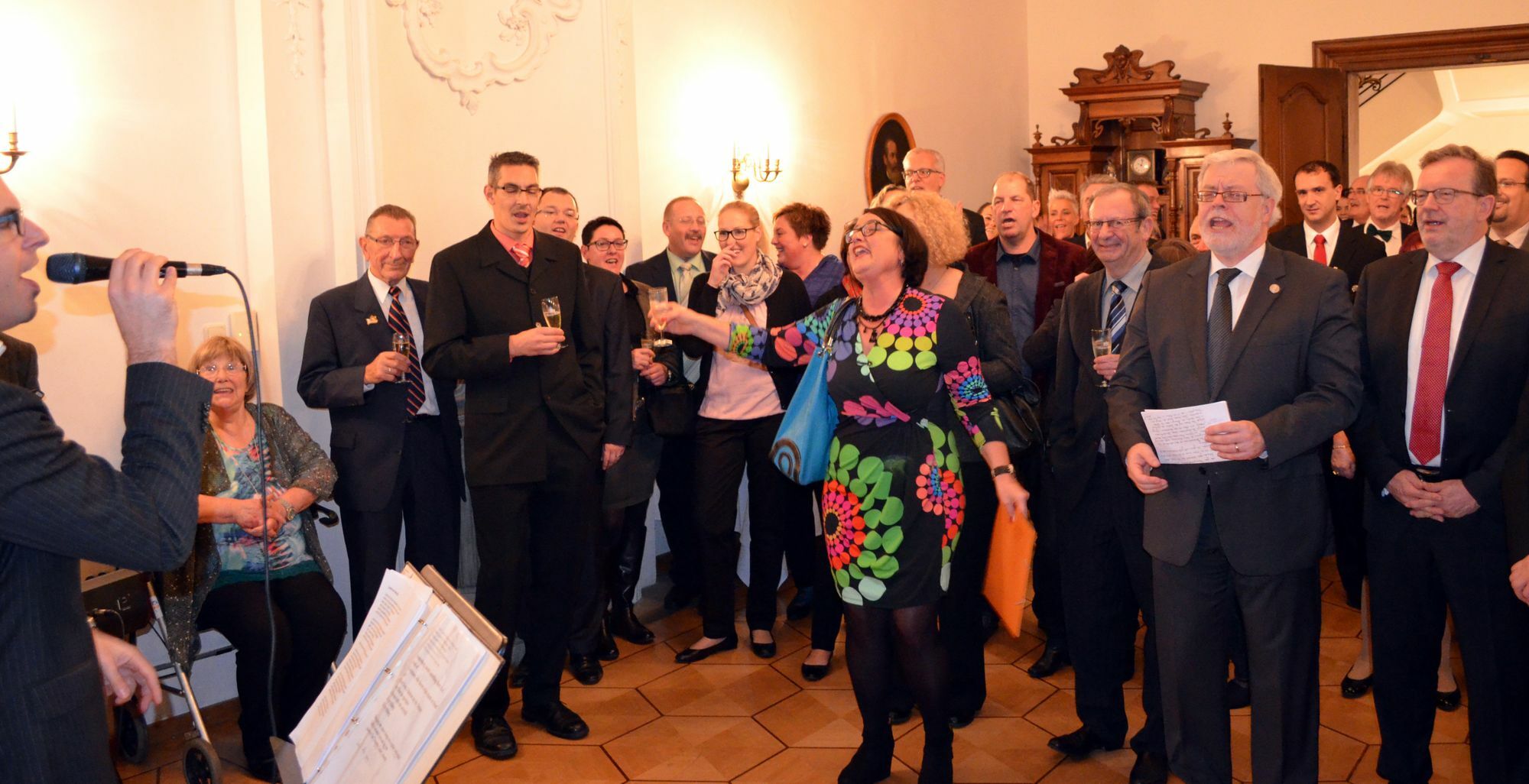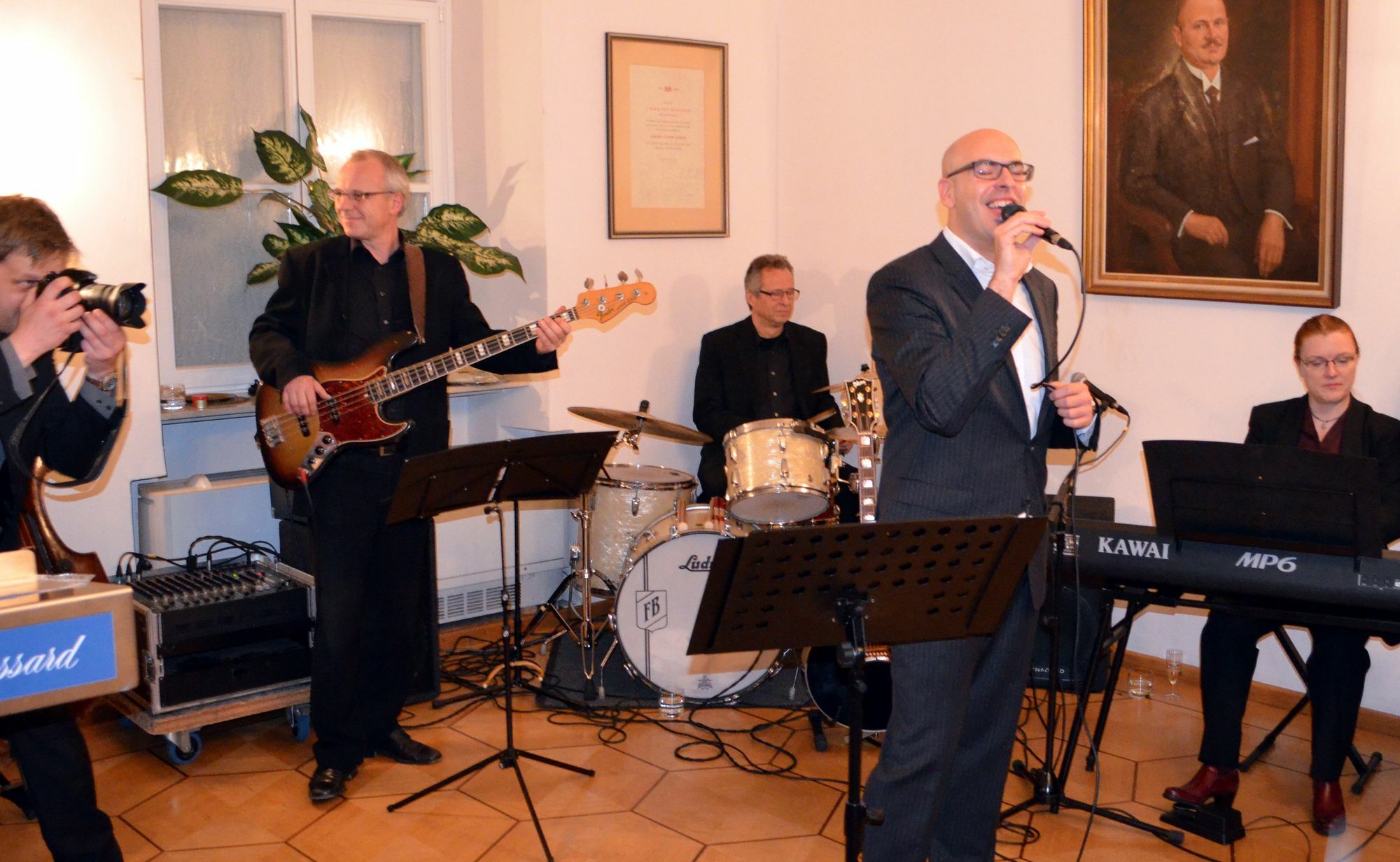 Für die gelungene musikalische Umrahmung der Veranstaltung sorgten im brütend warmen Barocksaal der Sektkellerei Bernard Massard neben dem Peter Kasper Trio die Solisten Thomas Kiessling und Daniel Bukowski, die zur Überraschung und Freude der Preisträgerin ("wie geil is das denn...?") einige ihrer Lieblingslieder intonierten. Von "Love is in the air" über "Ich war noch niemals in New York" bis zu "With a little help of my friends", "All you need is Love" und zum Abschluss "Let the sunshine" vereinten sie die Gäste zum lautstarken "Weißebach-Chor". Emotionaler Höhepunkt Thomas Kiesslings "Nessun Dorma", das die frisch gekürte Preisträgerin zu Tränen rührte. Mehr im nächsten Wochenspiegel!