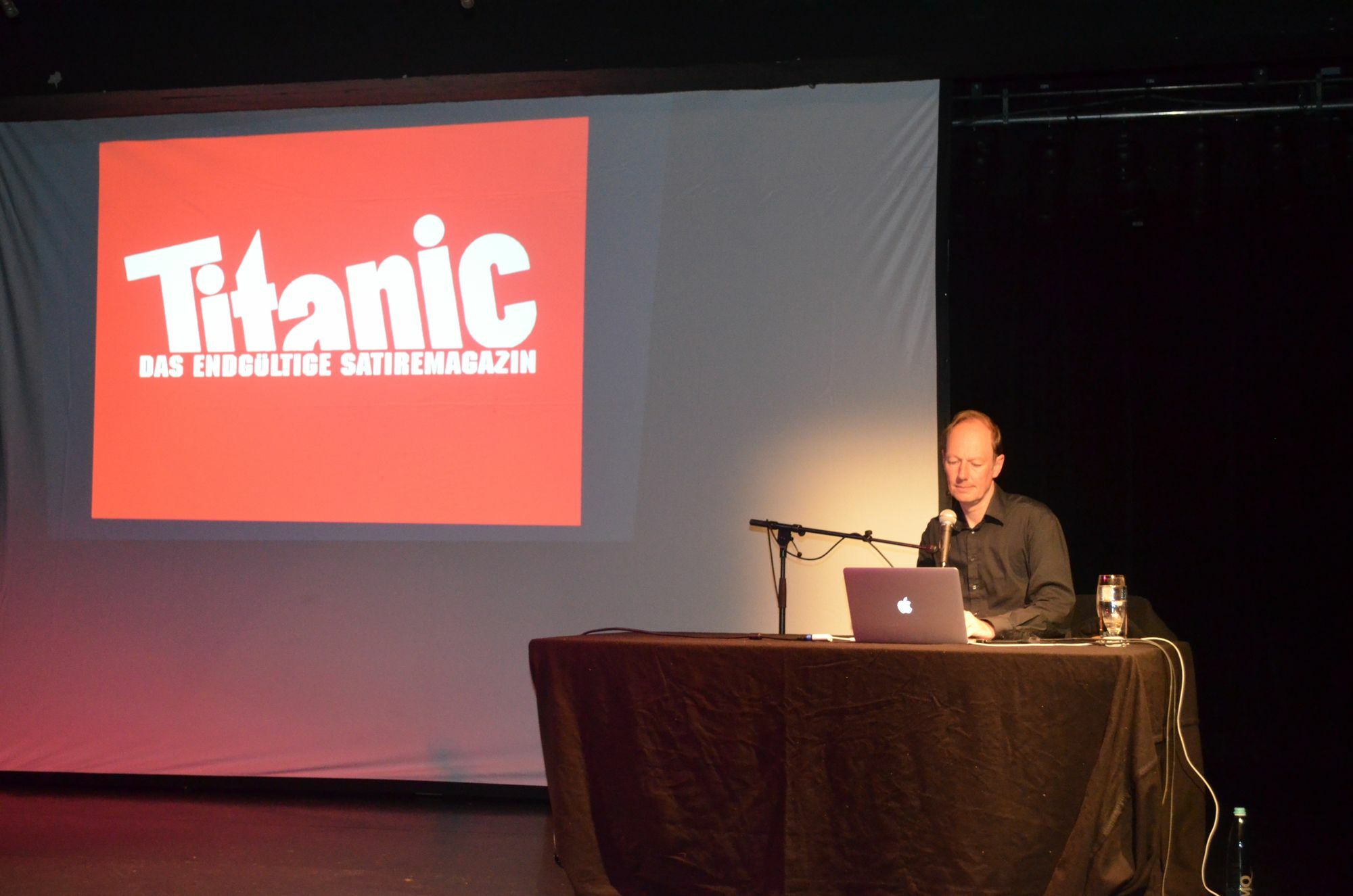 Unter tosendem Applaus betrat der ehemalige Titanic-Chefredakteur und "die PARTEI"-Gründer die Bühne und freute sich erst Mal in "Dings" zu sein, das er bislang vorwiegend von Tankausflügen nach Luxemburg kannte. In seinem gut zweistündigen Auftritt erklärte er, wie er seine Partei "die PARTEI" gründete, wie sich diese von der Kneipenpartei zu einer (fast) ernsthaften Konkurrenz der alteingesessenen Parteien entwickelte und wie man Wahlkampf ohne finanzielle Mittel macht und damit sogar ins EU-Parlament einziehen kann. Zur Anschauung verwendete Sonneborn dabei kleine Einspieler und Bilder. Die zeigten Mal von der PARTEI überarbeitete Wahlplakate der NPD oder Sonneborn bei einer Rede im EU-Parlament über "den Irren vom Bosporus" (Recep Tayyip Erdogan). Vollkommen in sich ruhend berichtete er über seinen Disput mit dem seit 1989 im EU-Parlament vertretenen "Lobbyisten" Elmar Brok (CDU). Zusammen mit einem bissigen Kommentar hatte Sonneborn ein Foto beim Kurznachrichtendienst Twitter veröffentlicht, das den "Bro(c)ken" im Tiefschlaf zeigte, während er als Teilnehmer einer hochrangig besetzten Podiumsdiskussion neben Generälen und anderen EU-Spitzenpolitikern saß.