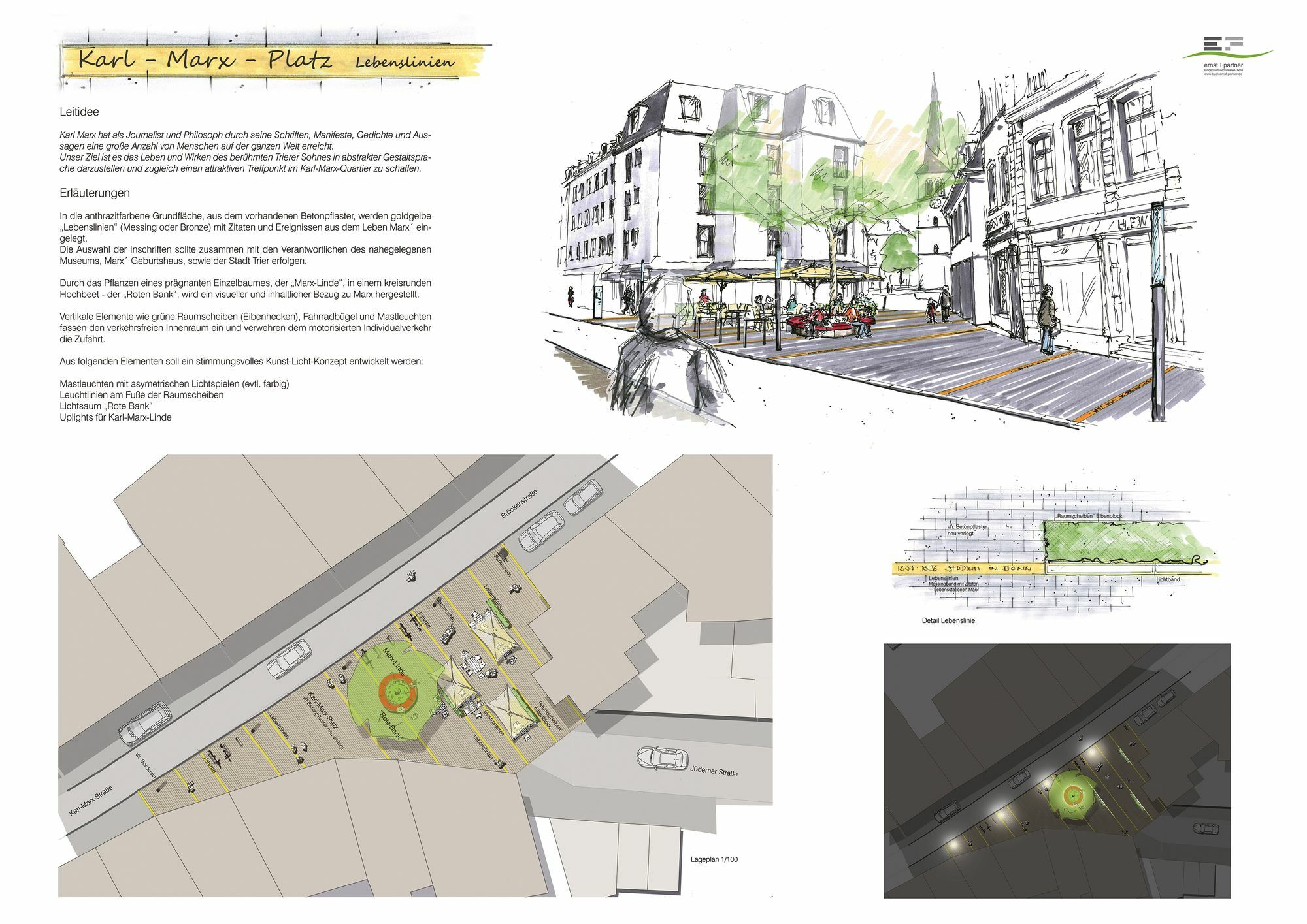 Die ursprüngliche Idee, die Marx-Skulptur in der Nähe des Geburtshauses an der Ecke Brücken-, Karl-Marx- und Jüdemerstraße aufzustellen, kam wegen der Dimension des Kunstwerks nicht zum Tragen. Dennoch soll der kleine Platz bis zum Jubiläumsjahr 2018 aufgewertet werden. Das Stadtplanungsamt hatte hierzu einen kleinen Wettbewerb veranstaltet, aus dem der Entwurf des Büros Ernst und Partner als Sieger hervorging. Der Platz soll durch eine Pflasterung als Einheit wahrgenommen werden. Außerdem sollen in goldgelbe "Lebenslinien" im Bodenbelag Zitate und Lebensdaten von Karl Marx eingearbeitet werden. Fahrradbügel und Leuchten fassen den verkehrsfreien Innenraum, ein Lichtkonzept sorgt für ein stimmungsvolles Ambiente am Abend. In dem Entwurf ist zudem die Pflanzung einer "Marx-Linde" im Mittelpunkt des Platzes vorgesehen, die von einer kreisrunden roten Sitzbank eingefasst wird. In diesem Punkt soll jedoch, so Baudezernent Andreas Ludwig, bei der Umsetzung von dem Konzept abgewichen werden, um die schon vorhandenen Bäume nicht entfernen zu müssen.