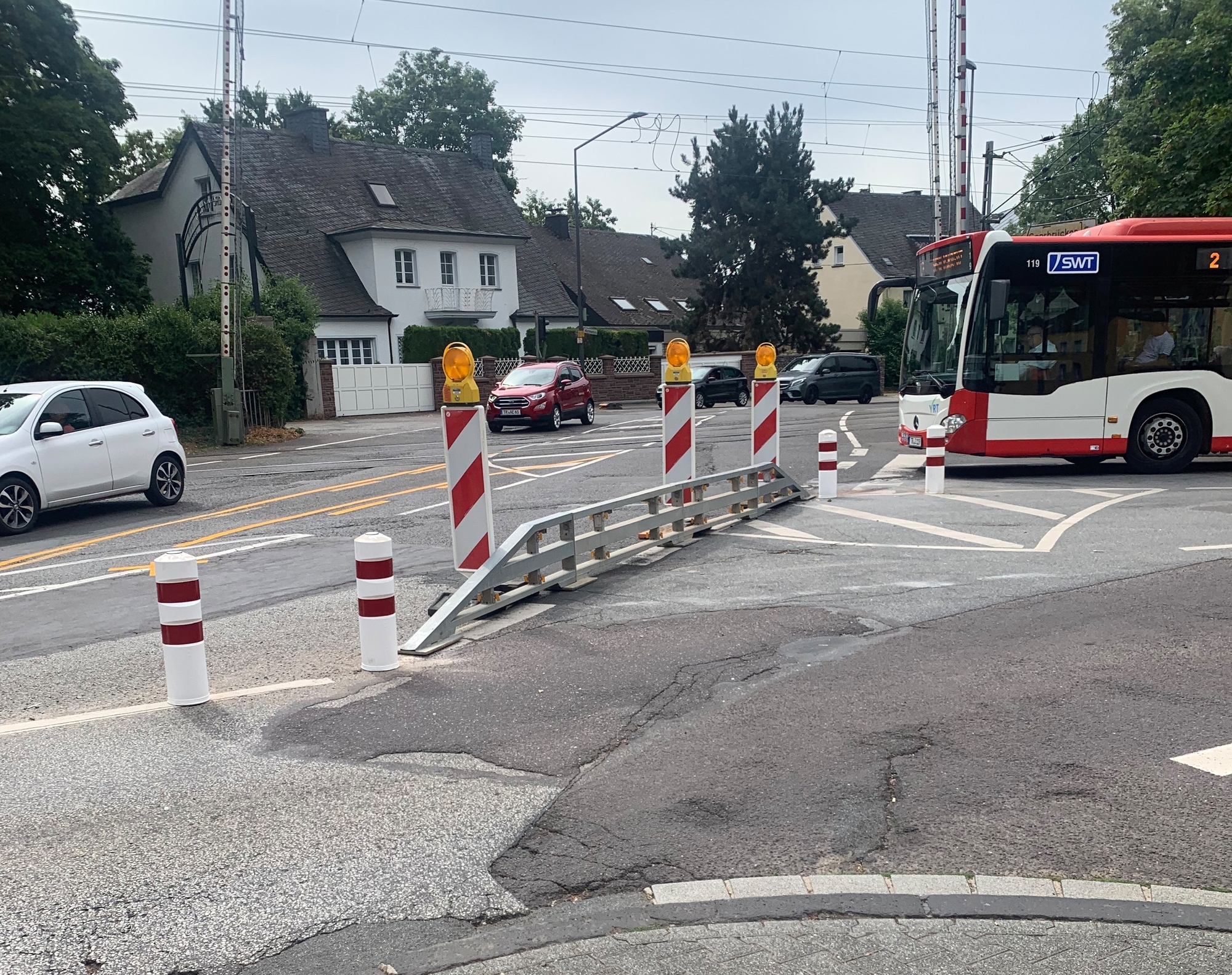 Trotz des Verbots haben in den vergangenen Wochen zahlreiche Verkehrsteilnehmerinnen und -teilnehmer diese „Abkürzung“ genutzt. Dieses Verhalten ist besonders dann gefährlich, wenn sich die Linksabbieger bis über den Bahnübergang stauen und sich ein Zug nähert. Auch eine Beschilderung mit dem Verkehrszeichen „vorgeschriebene Fahrtrichtung rechts" und eine gelb markierte durchgezogene Linie auf der Fahrbahn haben die Situation nicht wesentlich verbessert.