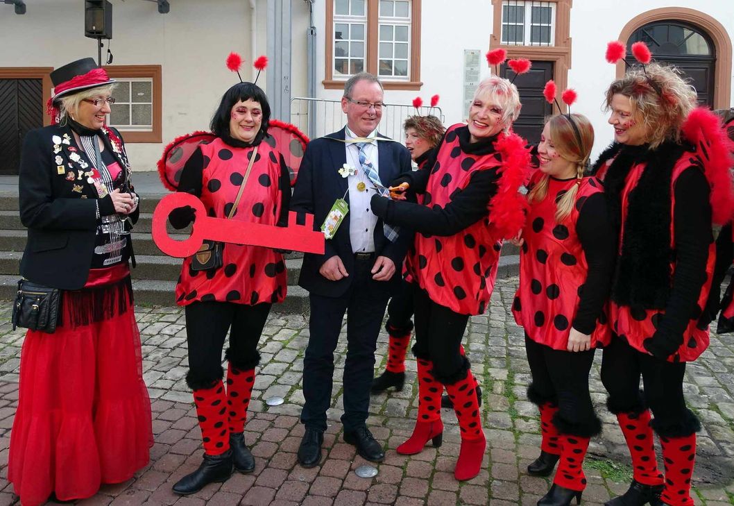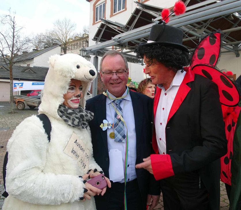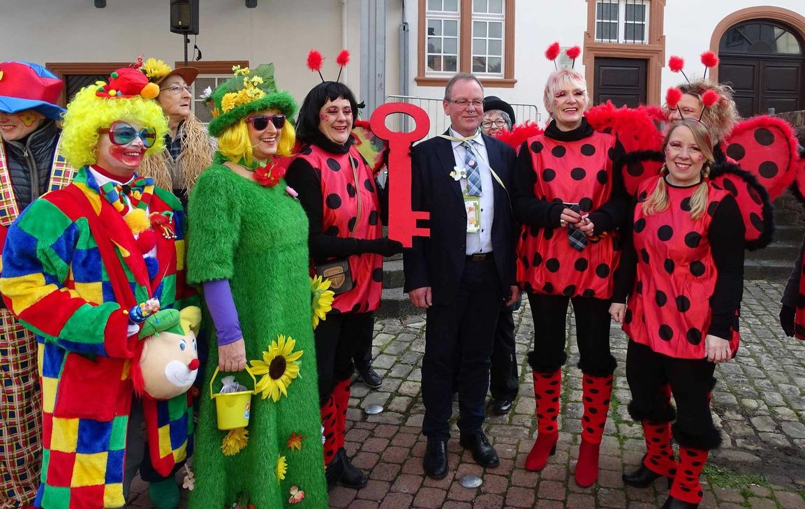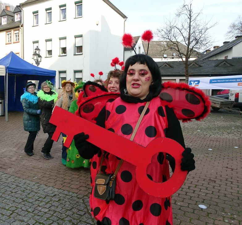 Bürgermeister Jürgen Dixius wurde lauthals dazu aufgefordert, sein Büro zu verlassen und nach draußen zu kommen. Er erschien auch gleich auf dem angrenzenden Boemundhof und brachte einen riesigen Schlüssel mit, den er den Möhnen überreichte. Seine Krawatte wurde trotzdem abgeschnitten. In ausgelassener Stimmung feierten die närrischen Gäste, die allesamt kostümiert waren, noch bis in den Nachmittag hinein. JM, Fotos: Mohsmann