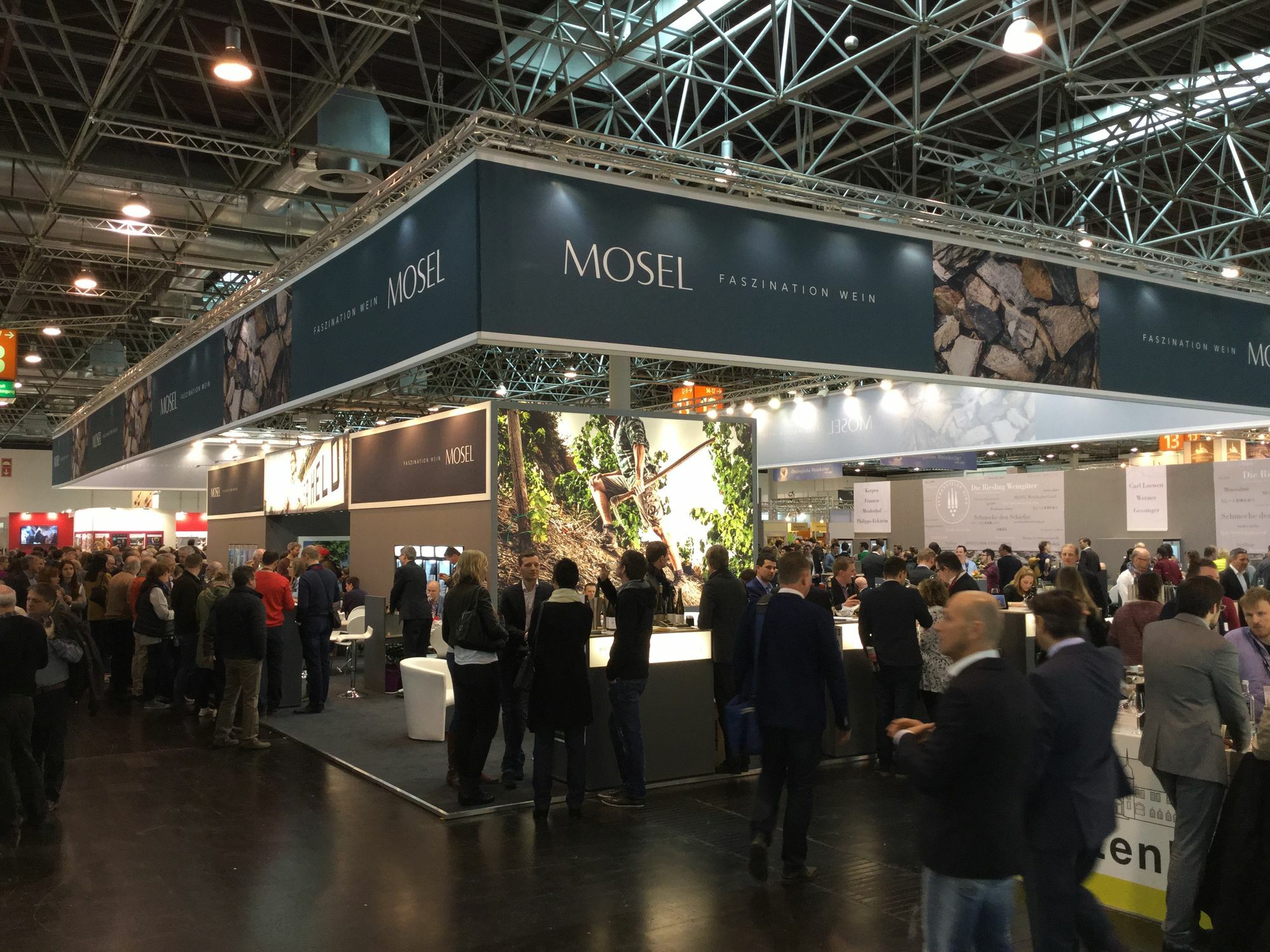 Der Moselwein hält am erfolgreichen Standkonzept im neuen Design der Gebietsweinwerbung fest. Eine Deckenabhängung macht den Stand in Halle 13 weithin sichtbar. Großflächige, moderne Fotos von Winzern in Steillagen ziehen die Blicke der Besucher auf den Stand. Die Standeinheiten der Betriebe gruppieren sich um Lager und Küche. Loungebereiche laden die Fachbesucher aus aller Welt zum Gespräch mit den Moselwinzern ein. Etwa 130 Personen sind am Stand im Einsatz, von Mosel-Weinkönigin Lena Endesfelder über das Team der Weinwerbung bis zu den Mitarbeitern der ausstellenden Weingüter. Unter dem Dach der Gebietsweinwerbung stellen neben Betrieben von der Saar bis zur Terrassenmosel auch die Weingütervereinigungen Bernkasteler Ring sowie die Jungwinzervereinigung MoselJünger aus. Neu am Stand sind in diesem Jahr erstmals Weingüter aus Cochem, Trittenheim, Kesten sowie aus Kasel an der Ruwer.