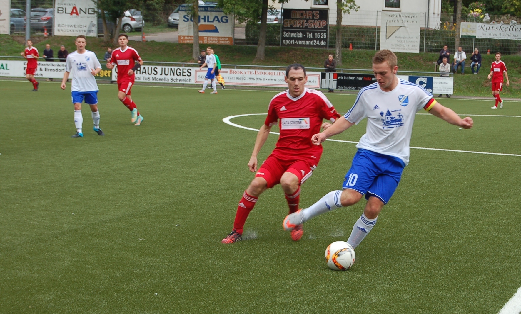 Aufstellung Mosella Schweich: Simon - Frick (883. Steffgen), Hoffmann, Gäbler, Quary - Seeberger (46. Schabo), Thomas Schleimer, Pitsch, Flesch - Stefan Schleimer (76. Hemmes), Oltmanns. Aufstellung SG Malberg/ Rosenheim: Zeiler - Peter Gerhardus (43. Märzhäuser), Kostka, Steffen Gerhardus, Heidrich - Nickol (88. Falk), Hombach, Weinlich, Schönberger (71. Brenner) - Blum - Scherreicks. Schiedsrichter: Alex Krüger (Mompach/Luxemburg) Zuschauer:190 Tore: 1:0 Flesch (35.), 1:1 Nickol (41.). Platzverweis: Steffen Gerhardus (84., Gelb-Rot)