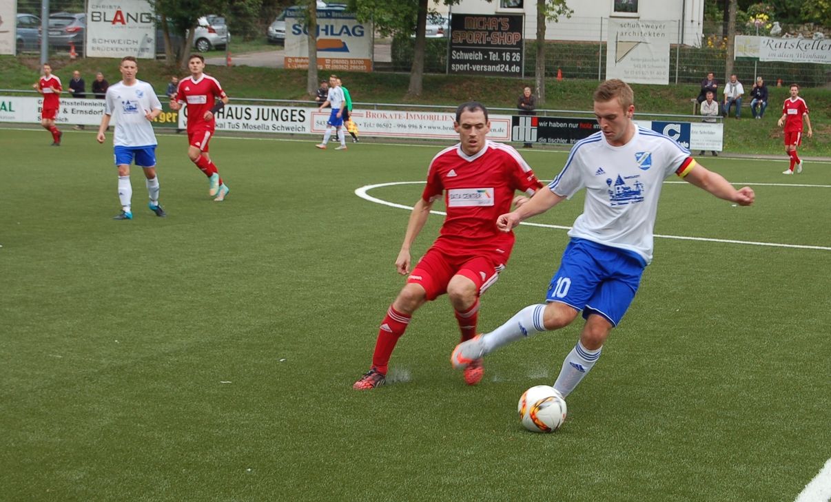 Auch nach dem Seitenwechsel zeigte sich die SG bissig in den Zweikämpfen und verzeichnete auch wieder Torabschlüsse: Mit seinem verdeckten Schuss zwang Scherreicks den Schweicher Keeper Simon sieben Minuten nach dem Seitenwechsel zu einer Glanzparade. Wenig später klärte Matthias Zeiler aus kurzer Distanz gegen Oltmanns (54.). "Mehr Einsatz!" Das forderte Schweichs zunehmend unzufrieden wirkender Trainer von seinen Schützlingen. Das wiederum konnten die Gäste auch als Lob werten, schließlich machten sie es den sonst gerade zu Hause meist so schwungvoll auftretenden Schweichern mit ihrer kompakten Spielweise auch schwer. Wenn die SG-Abwehr mal einen Ball passieren ließ, war stets Schlussmann Zeiler zur Stelle; in der 70. Minute klärte er noch einmal mit gekonnter Fußabwehr gegen Stefan Schleimer. Auf der anderen Seite scheiterte Weinlich zunächst am Außennetz (71.), dann fand er seinen Meister in Mosella-Torwart Simon. Sonntag, 15 Uhr, gastiert die Mosella nun beim Aufsteiger SG Andernach 99. Das Rheinlandpokalmatch gegen Regionalligist Eintracht Trier wurde unterdessen auf Mittwoch, 30. September, 19.30 Uhr, terminiert.