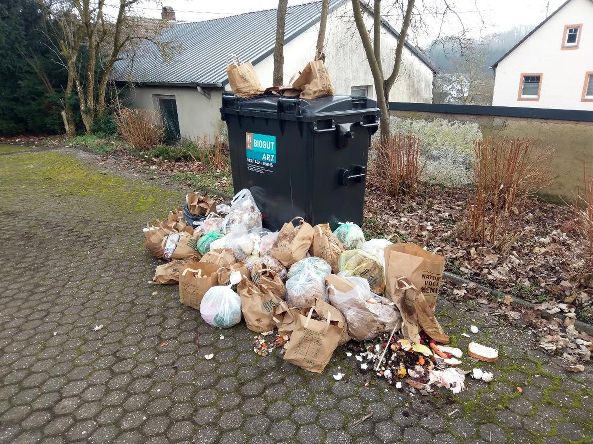 Jens Diercks aus Ockfen schildert: »Um den Müll nicht immer aus dem Behälter zu waschen (die Tüten sind schnell durchgeweicht), hatte ich die Idee, die Tüte zusätzlich in eine Mülltüte zu tun und dann in diesen Behälter zu geben. Nachdem ich das eine Woche praktiziert habe, fuhr ich mit der Tüte in das vier Kilometer entfernte Saarburg, um die Biotüte zu entsorgen. Beim Herausnehmen der Biotüte aus der Plastiktüte fiel der gesamte Biomüll aus der durchweichten Papiertüte auf die Straße...«