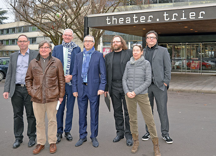 OB Wolfram Leibe (3. v. l.) möchte mit dem Leitungteam bestehend aus Verwaltungsdirektor Herbert Müller, dem technischen Leiter Peter Müller, Generalmusikdirektor Victor Puhl, Chefdisponent Marius Klein-Klute, Tanzchefin Waltraut Körver und Schauspieldirektor Ulf Frötzschner (v. l., nicht im Bild die erkrankte Katharina John) das Theater in eine erfolgreiche Zukunft führen. Foto: Presseamt