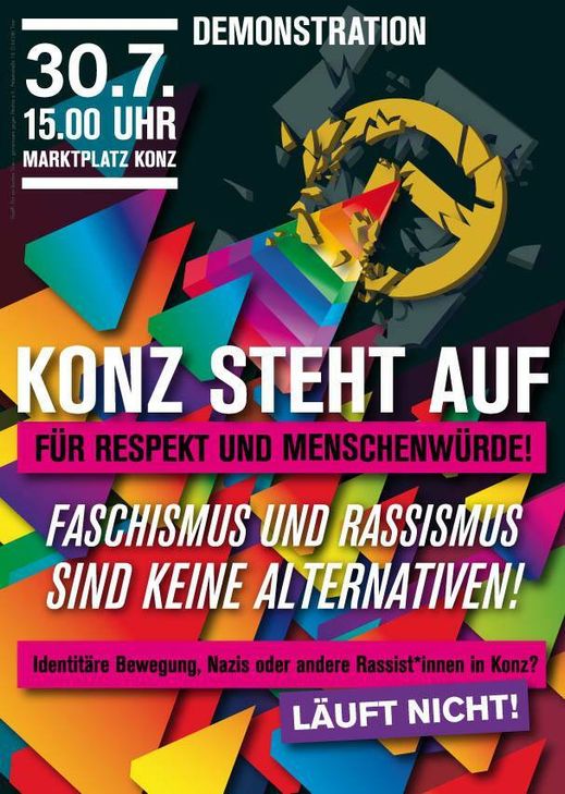 Die Gemeinschaft für ein buntes und weltoffenes Konz, eine Gruppe engagierter Konzer Bürger, ruft zur Demonstration am Samstag, 30. Juli, um 15 Uhr auf dem Konzer Marktplatz auf. Unter dem Motto "Konz steht auf für Respekt und Menschenwürde – Rassismus und Faschismus sind keine Alternativen!" will man lautstark Position beziehen für eine vielseitige, weltoffene Gesellschaft und Gleichberechtigung aller Menschen.