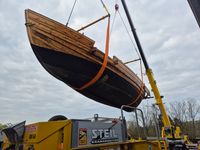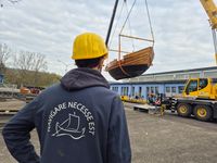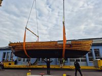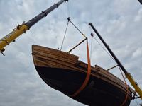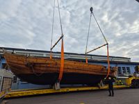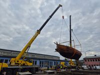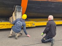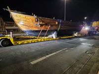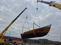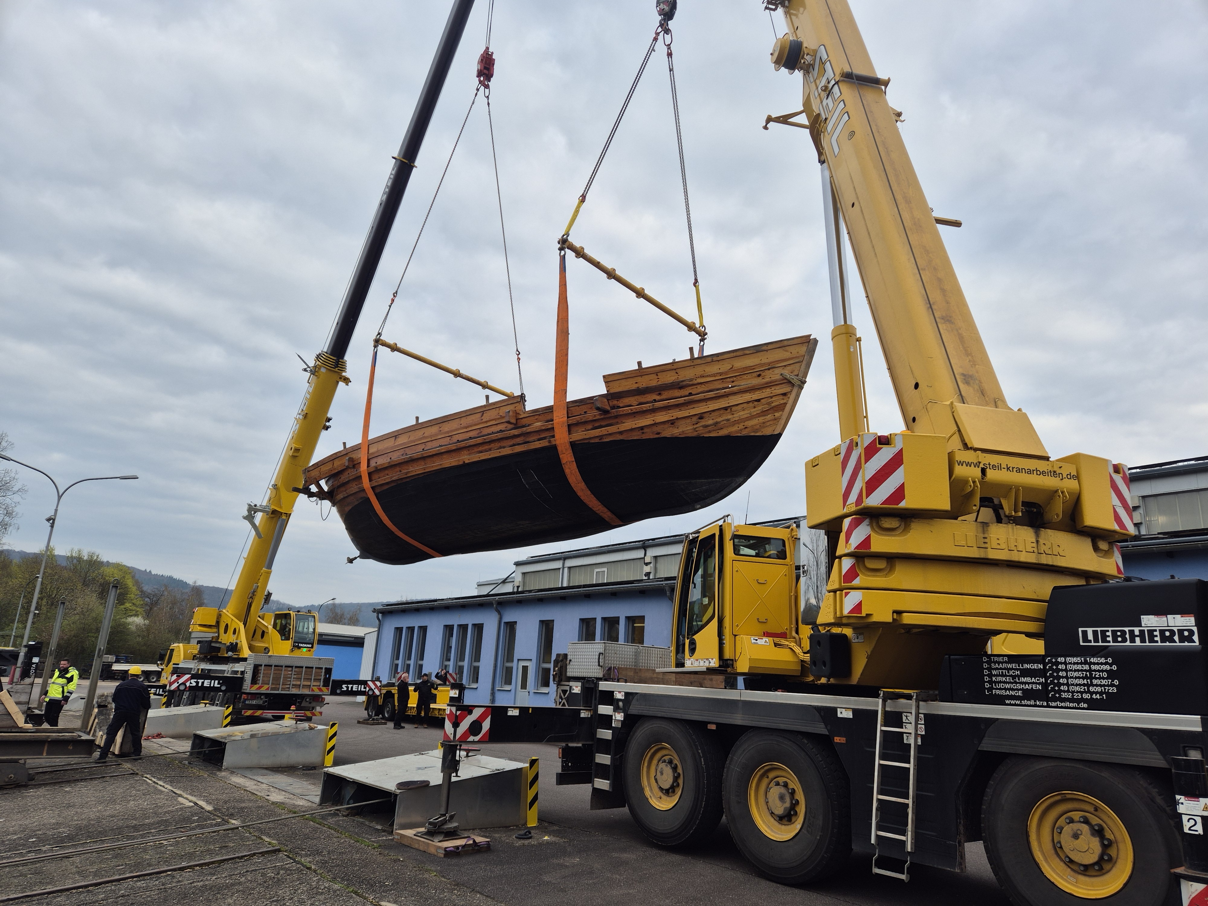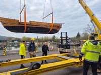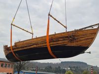 Das originalgetreu nachgebaute Handelsschiff „Bissula“ war über zweieinhalb Jahre auf verschiedenen Gewässern im Einsatz. Am Montag wurde es an der Mosel bei der Staustufe Trier aus dem Wasser gehoben und mithilfe von Kränen auf einen Schwertransporter verladen.