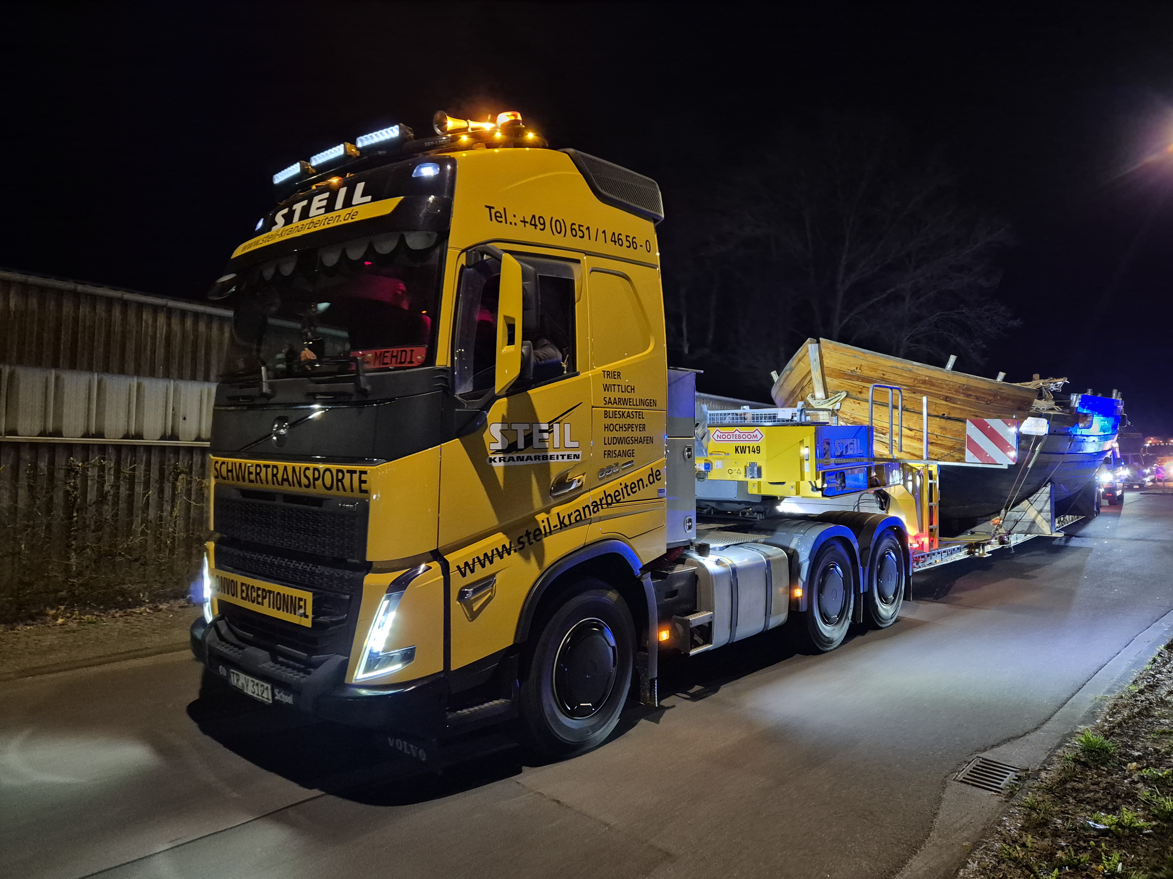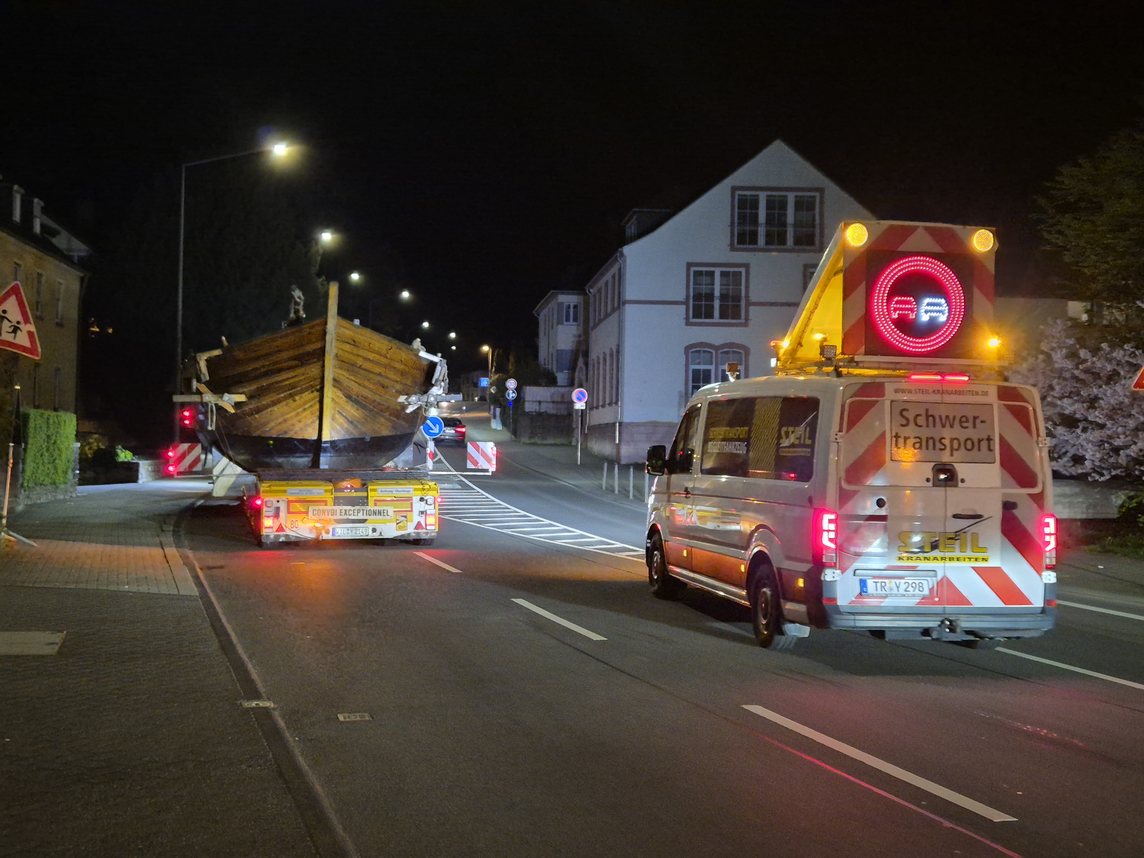 Am späten Montagabend begann die letzte Etappe: Der Transport führte ab etwa 22 Uhr quer durch Trier – vom Industriegebiet Zewen über die Luxemburger Straße, die Konrad-Adenauer-Brücke und das Barbaraufer bis hin zur Südallee und weiter zur Universität. Damit endete ein bedeutender Abschnitt in der Geschichte des Schiffes.