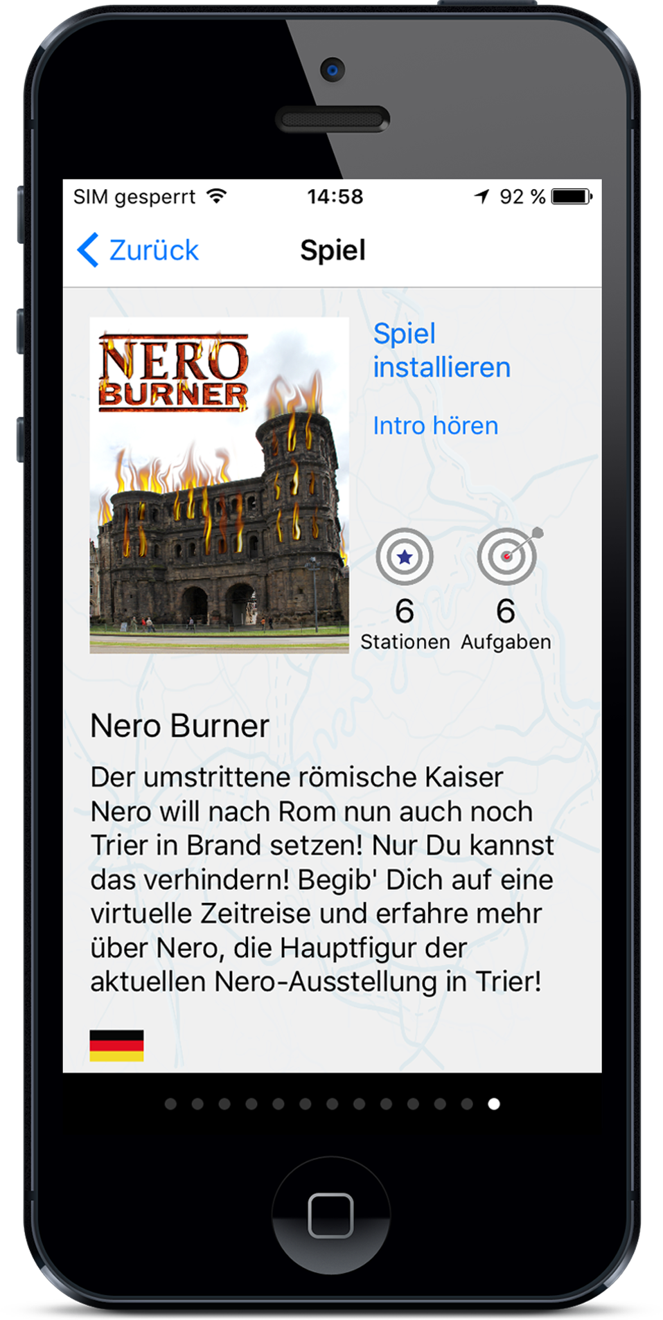 Mit dem App-Game "Nero Burner" will die Multimediaagentur neue Zielgruppen für die Nero-Ausstellung begeistern. Gerade junge Menschen, die sogenannten 'Digital Natives' sollen mit dem App-Game angesprochen werden. Das App-Game wird durch die Kulturförderung der Stadt Trier finanziell unterstützt.