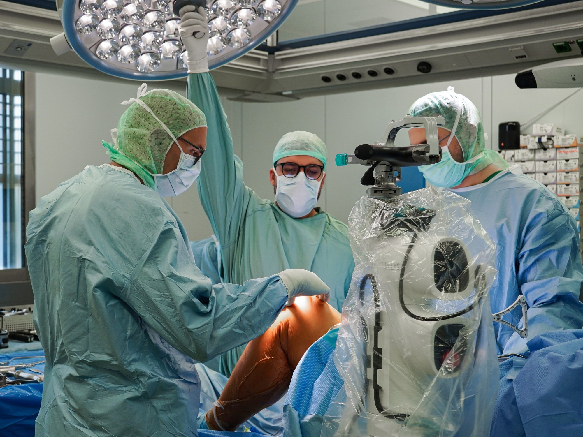 Dr. med. Elmar Schwarz, Chefarzt der Orthopädie und Unfallchirurgie, der die Operationen durchgeführt hat, ergänzt: „Die Implantation einer Kniegelenksprothese ist ein komplexer Eingriff, der in die Hände von erfahrenen Operateuren gehört. Im Vergleich zur konventionellen Präparation können wir nun Knieprothesen mit deutlich erhöhter Präzision implantieren. Hier reden wir von Abweichungen unter einen halben Millimeter, was aus operativer Sicht absolut beeindruckend ist. Der Roboter unterstützt uns dabei, die einzelnen Präparationsschritte auf die individuelle Anatomie des Patienten anzupassen, noch bevor der eigentliche Sägeschnitt durchgeführt wird. Wir behalten dabei aber jederzeit die volle Kontrolle.“