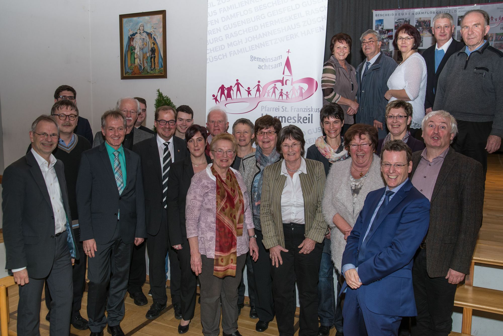 Am Wochenende folgten rund 160 Personen der Einladung zum Festakt des Feierlichen Zusammenschlusses der acht bislang bestehenden Pfarreien (Hermeskeil, Züsch, Gusenburg, Damflos, Bescheid, Beuren, Rascheid und Geisfeld) zu einer neuen Großpfarrei Sankt Franziskus ins Bürgerhaus nach Neuhütten. Entwicklung der Pfarrei in 2.000 Jahren Kirchengeschichte In einem festlichen Rahmen, in dem dieses historische Ereignis gewürdigt wurde, wurde zudem ein breiter inhaltlicher und historischer Bogen geschlagen. Prof. Dr. Bernhard Schneider von der Theologischen Fakultät Trier skizzierte in seinem Festvortrag die großen Linien der Entwicklung der Pfarrei in 2.000 Jahren Kirchengeschichte. Die musikalische Umrahmung übernahm der Männergesangverein Germania Neuhütten. Die Organisation lag in den bewährten Händen der Kultur- und Karnevalinitiative Neuhütten. Aufbruchstimmung und gewachsenes Gemeinschaftsgefühl Mit der Festwoche endet der mehr als drei Jahre dauernde Weg des Projekts »Wir gründen eine Pfarrei neuen Typs«. »Mit diesem Projekt stellen wir uns gut auf für die Veränderungen, die uns die Zukunft bringen wird«, sagte Dechant Clemens Grünebach. »Es war etwas von einer Aufbruchstimmung und einem gewachsenen Gemeinschaftsgefühl zu spüren«, führt er weiter aus. Weitere Aktivitäten der Festwoche sind die Messe mit anschließendem Frühstück (14. Januar, 9 Uhr, Kirche Grimburg) und ein Abschlussgottesdienst mit Weihbischof Helmut Dieser und anschließendem Fest im Mehrgenerationenhaus (17. Januar, 10.30 Uhr, Pfarrkirche Hermeskeil). Die Pfarrei St. Franziskus Hermeskeil umfasst rund 9.300 Katholiken der acht ehemals eigenständigen Pfarreien Bescheid, Beuren mit den Filialen Hinzert und Prosterath, die Pfarrvikarie Damflos, die Pfarrei Geisfeld, Rascheid mit Pölert, Hermeskeil mit den Filialen Abtei und Höfchen sowie Gusenburg mit der Filiale Grimburg und Züsch mit Neuhütten und der Filiale Muhl. Diese Pfarreien wurden im Zuge des Strukturplans 2020 im Bistum Trier nun zusammengelegt. Dienstsitz des Pfarrers Clemens Grünebach, der auch Dechant des Dekanats Hermeskeil-Waldrach ist, ist Hermeskeil. Zu seinem Team gehören ein Kaplan, ein Diakon, einen Franziskaner-Pater, zwei Gemeindereferenten und einen Pastoralassistenten. Unterstützt werden sie von einem Dekanatskantor, einer Sozialpädagogin und einer Erzieherin. Alle Veranstaltungen rund um die Eröffnungswoche sind in einem Flyer aufgeführt, der im Pfarrbüro (Martinusstraße 5, Hermeskeil) ausliegt oder online unter www.katholische-kirche-ruh.de/ abrufbar ist. FIS