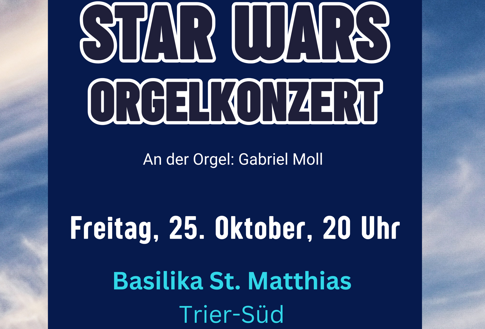 . Die Kompositionen von John Williams prägen die Filmreihe, die seit 1977 ein Millionenpublikum begeistert. Ende Oktober soll nun die Filmmusik das Publikum in Trier begeistern. Gabriel Moll (Jahrgang 1989) ist Organist in der Pfarrei St. Matthias Trier und hat sich mit seiner Offenheit für musikalische Experimenten einen Namen gemacht. Nachdem er mit den Harry-Potter- und Queen-Orgelkonzerten zuletzt Überraschungserfolge feiern konnten, werden auch zu diesem Höhepunkt im Konzertkalender wieder einige hundert Besucher:innen erwarten. Der Eintritt ist frei, das Konzert dauert rund eine Stunde.