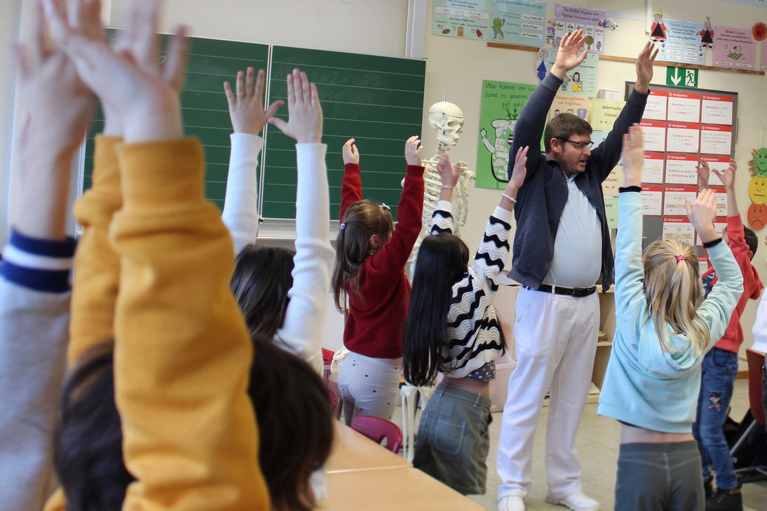 "Ein wichtiger Faktor für ein gesundes Wachstum ist eine gekräftigte Muskulatur. Und was macht die Muskeln stark? Bewegung!", hob der Mediziner hervor und forderte die Klasse zum "Rückenrodeo" und "King Kong" auf. Mit diesen und weiteren Übungen zeigte er auf, wie man sich auch im Schulalltag fit halten kann.