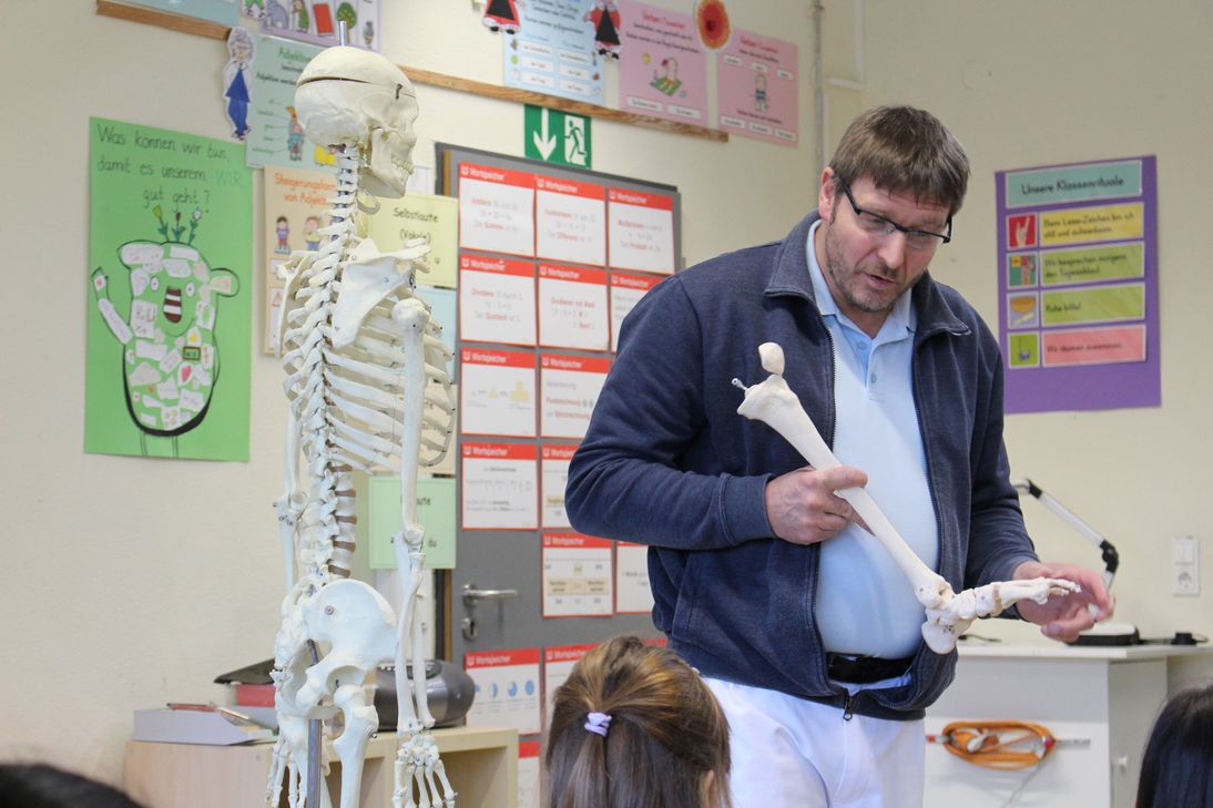 Mit einem Wirbelsäulenmodell im Gepäck betrat Dr. med. Arne-Björn Jäger nach der großen Pause das Klassenzimmer der Drittklässler und eröffnete mit der Frage "Wozu zählt der Mensch"? seinen Besuch. Eine Antwort ließ nicht lange auf sich warten: "Zu den Wirbeltieren", meldete sich eine Schülerin.