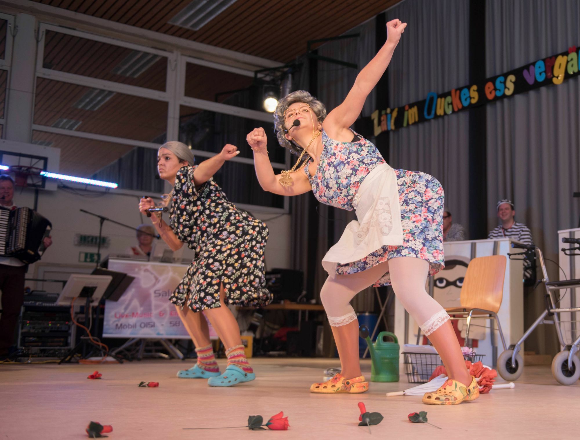 Sitzungspräsident Niklas Peters führte durch das bunte Programm, das viele Höhepunkte bot. Der Auftritt der beiden Tanzmariechen Julia Willems und Sophia Mich brachte die ausverkaufte Narhalla direkt zu Beginn in Stimmung. Die Narrengilde Schweich und die Karnevalsfreunde aus Hockweiler sprachen ihre närrischen Grüße aus. Aber es gab auch viel zu Lachen: In einer Gesangsdarbietung der etwas anderen Art vertauschten Dieter Schellen und Bettina Blau mit viel Witz ihre Geschlechterrollen. Maren Steier und Angelina Esch waren zwei alte Damen auf Friedhofsbesuch. Musikalisch wurde die Sitzung von der Band „GaWo Salus Musica“ begleitet. mw/Fotos: Willems