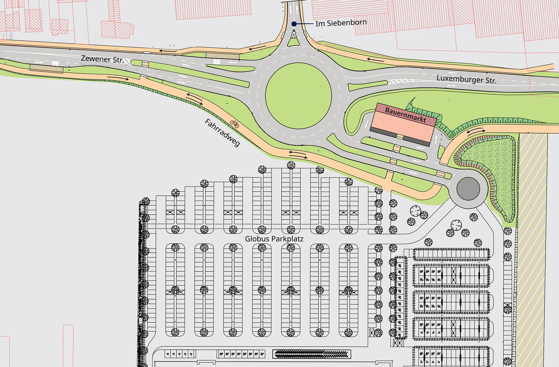 Zwei Kreisverkehre geplantFür die Anbindung des Marktes ist der Umbau der Zewener Straße inklusive der bisherigen Busspuren vorgesehen. Zudem soll die Straße „Im Siebenborn“ angepasst werden.