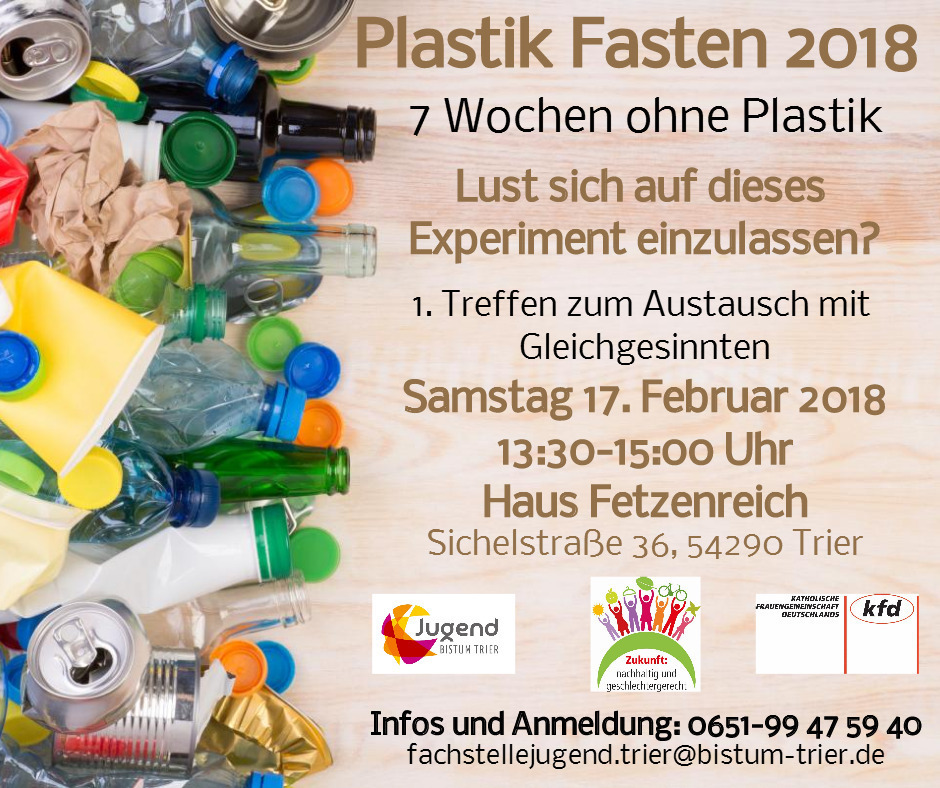 Die KDF möchte dazu anregen, den Plastikverbrauch zu reduzieren und ruft deshalb dazu auf, sieben Wochen komplett auf Plastik zu verzichten. Das erste Austauschtreffen findet am Samstag 17. Februar, von 13.30 bis 15 Uhr im Haus Fetzenreich (Sichelstraße 36) in Trier statt. Infos und Anmeldung unter Telefon 0651/99475940 oder per E-Mail unter: fachstellejugend.trier@bistum-trier.de