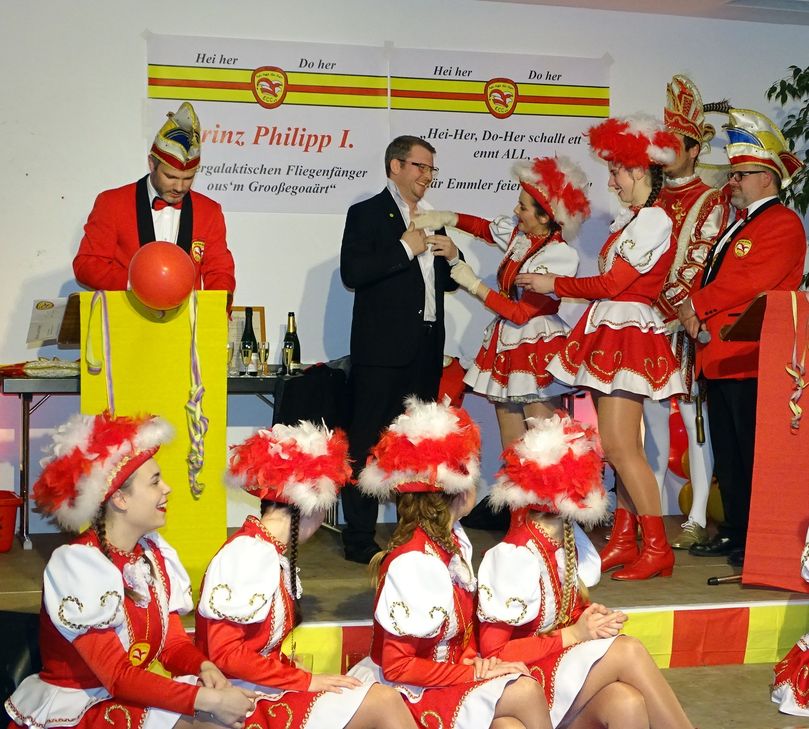 Wie es bei Majestäten so üblich, stehen Prinz Philipp Personal in Form eines Adjutanten (Jens Hoffmann) und eines Fahrers (Andre Kleinjohann) zur Seite. "Es ist eine Ehre für mich, hier stehen zu dürfen" erklärte der Inthronisierte und erließ prompt ein Gesetz, das besagt, dass in Oberemmel während seiner Amtszeit nur noch Wasser für die Körperreinigung zu benutzen sei. Ortsvorsteher Hermann-Josef Benzkirch überreichte den obligatorischen Amtsschlüssel und forderte bei Rückgabe eine volle Kasse. Die beiden Sitzungspräsidenten des ECC, Matthias Schu und Sebastian Lorenz, moderierten die närrische Veranstaltung in dem vollbesetzten Bürgerhaus, die musikalisch von der Hofkapelle Oberemmel unter der Leitung von Burghart Müller begleitet wurde. JM, Fotos: Mohsmann