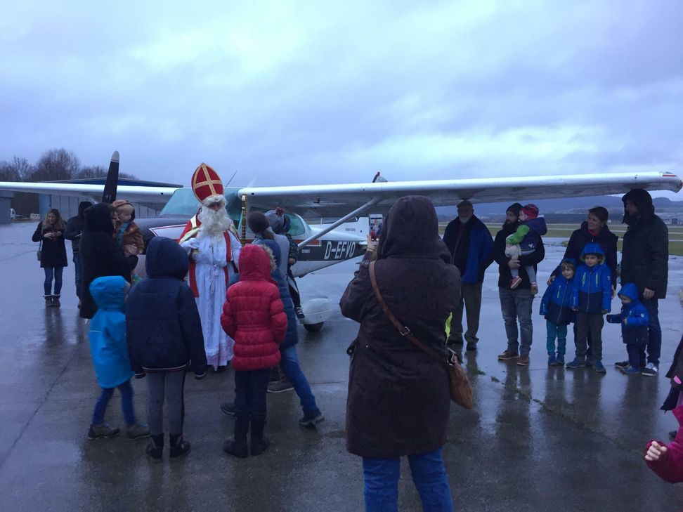 Gegen 16 Uhr war es dann soweit: Die Cessna 172 mit dem außergewöhnlichen Gast setzte sanft auf der Landebahn auf. Aufgeregt empfingen ihn die kleinen Besucher auf dem Vorfeld des Flugplatzes und begleiteten ihn zum Clubhaus, wo er Geschenke an die artigen Kinder verteilte. Diese bedankten sich beim heiligen Nikolaus mit Gedichtchen, Liedern oder selbstgemalten Bildern.